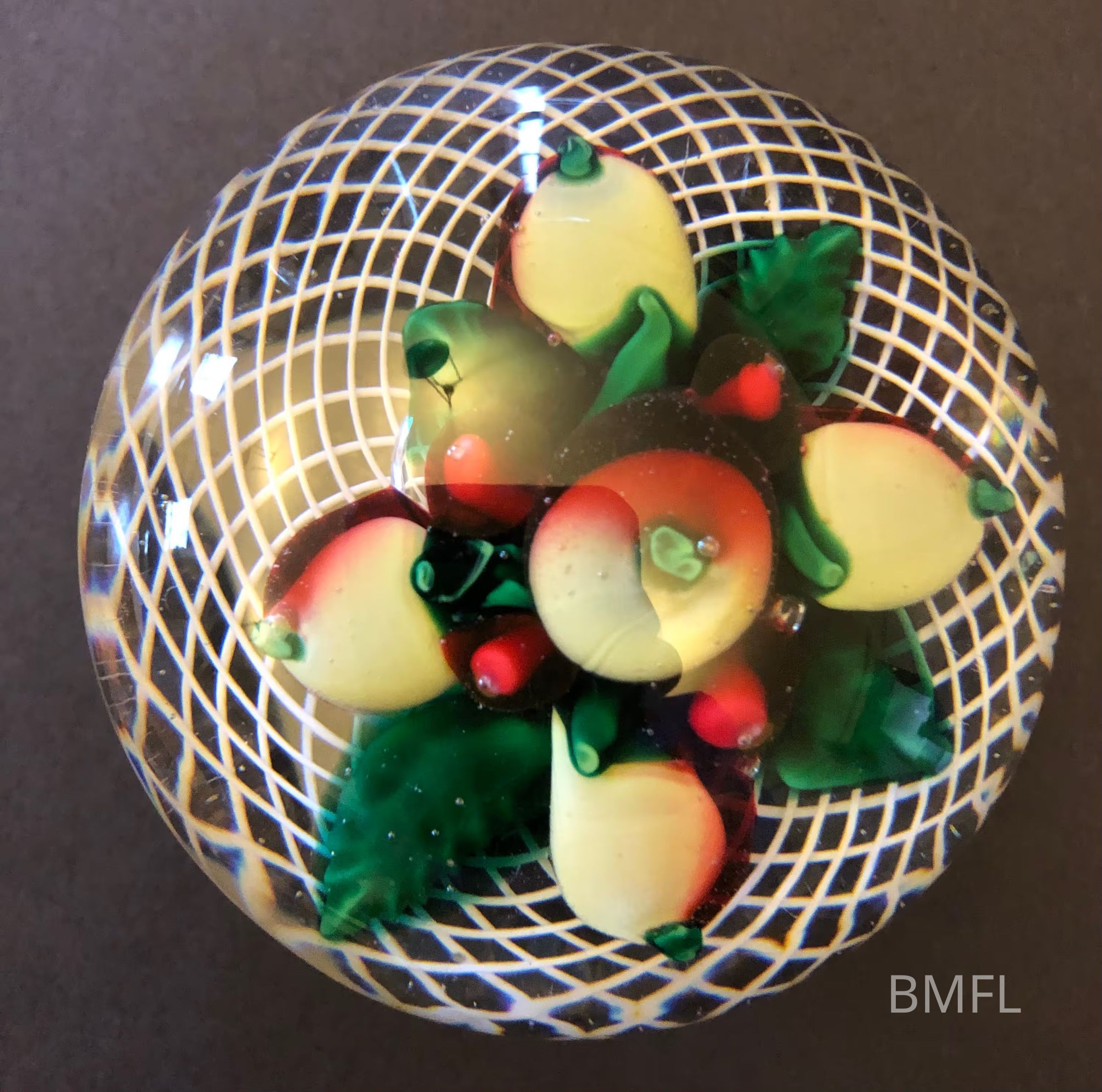 Round glass paperweight with small white and red fruits and tiny red berries, green leaves, and intricate etching as background.Use