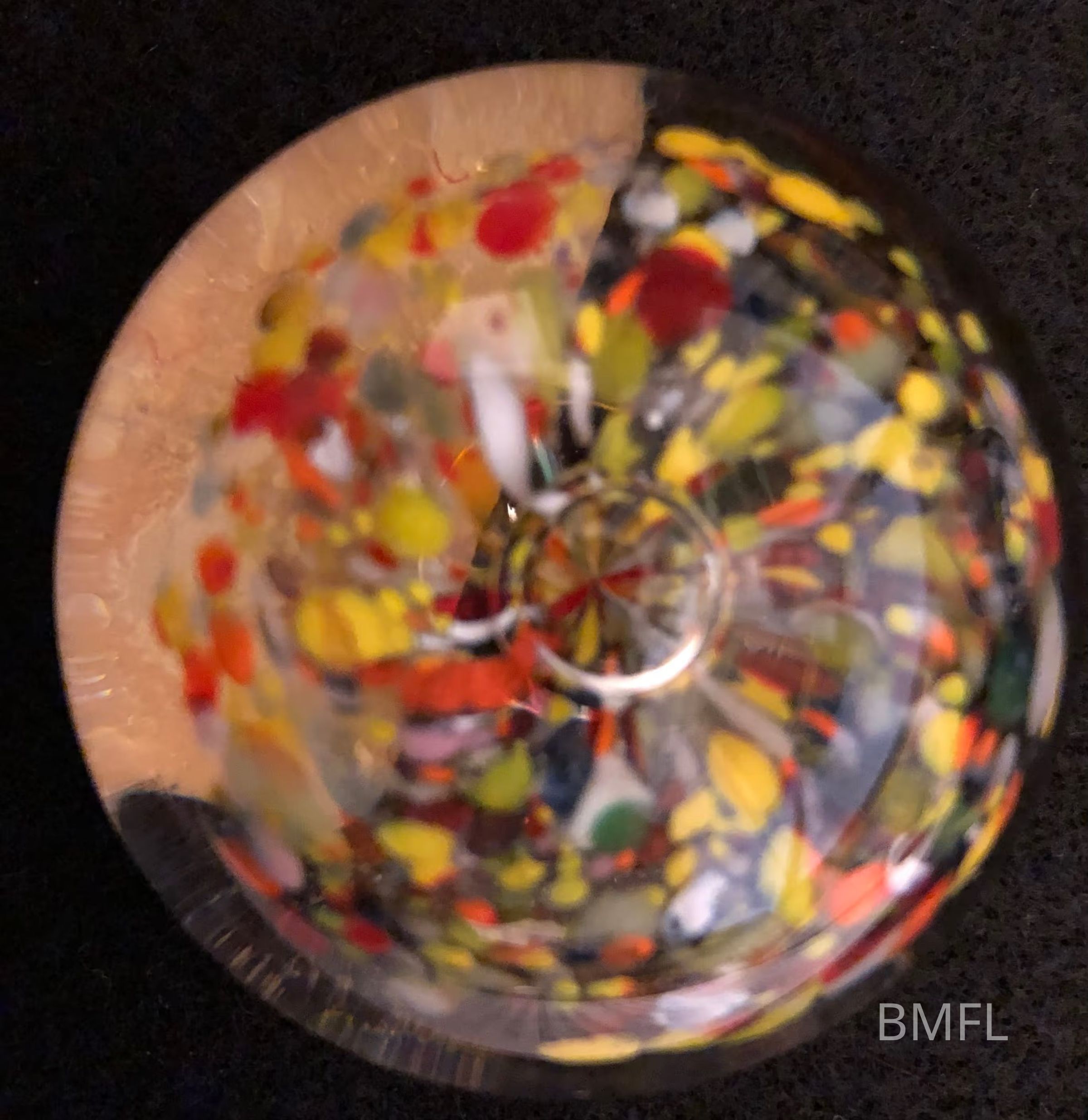Round glass paperweight with a multicolored array of glass pieces, artfully arranged in a cluster with a blown bubble on the top.Use