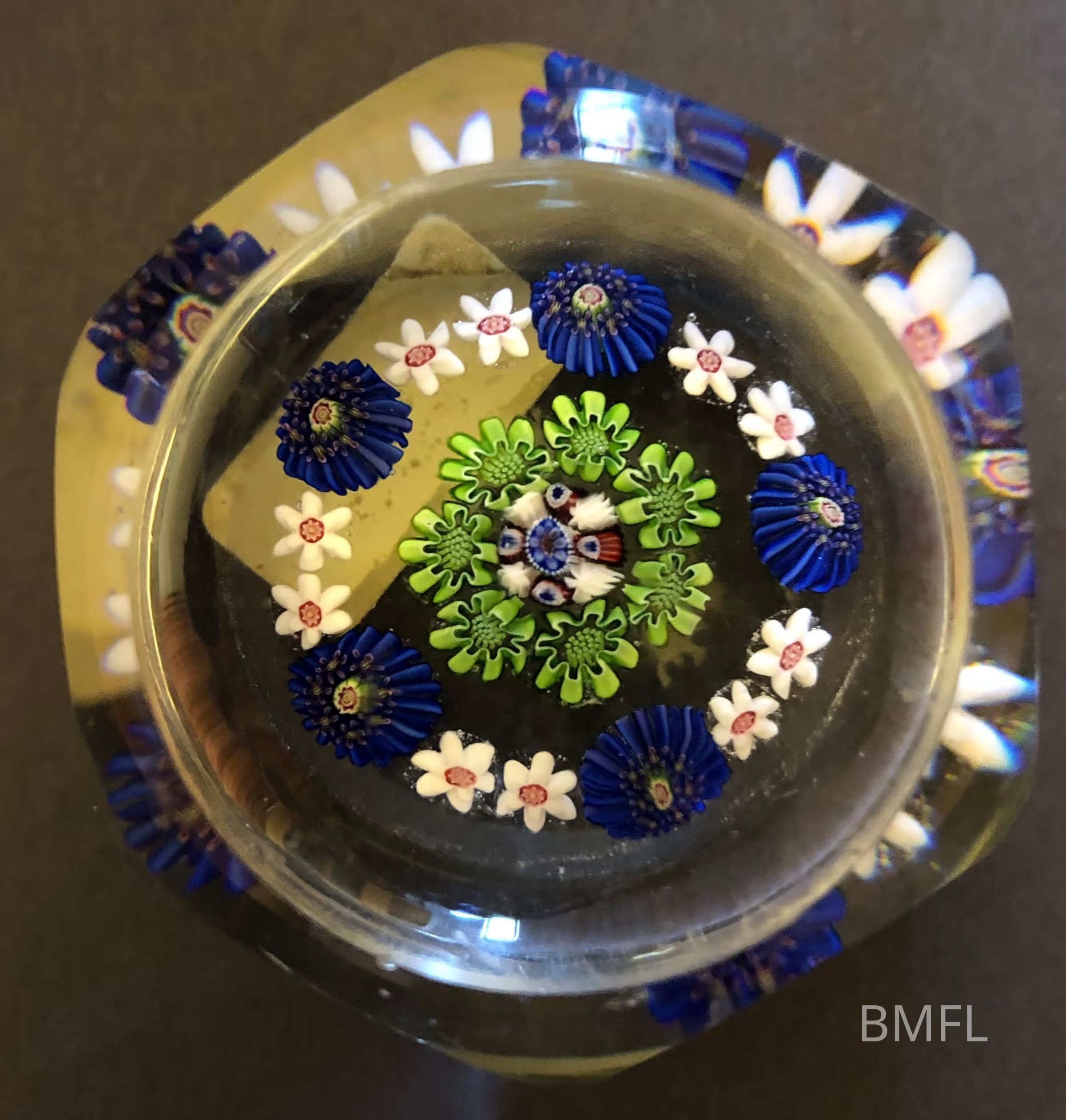 Six-sided glass paperweight with round top which accentuates the arrangement of small green and white flowers alongside larger blue flowers.Use