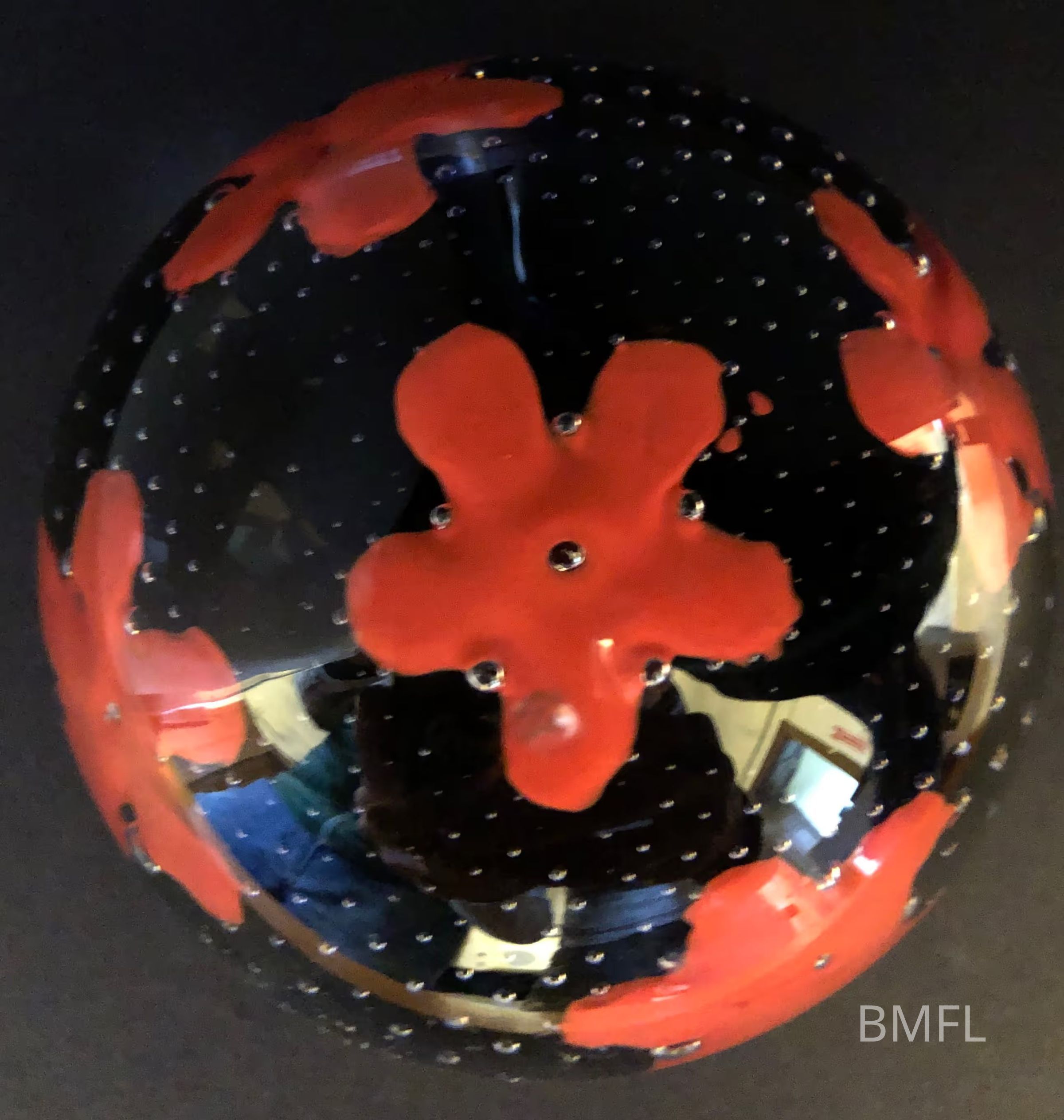 Round blue glass paperweight with several simple red flowers evenly spaced around inside, each with a very small glass bubble center and bubble accents at the points where each petal meets another. The globe itself has a design made from tiny glass bubbles all around.Use