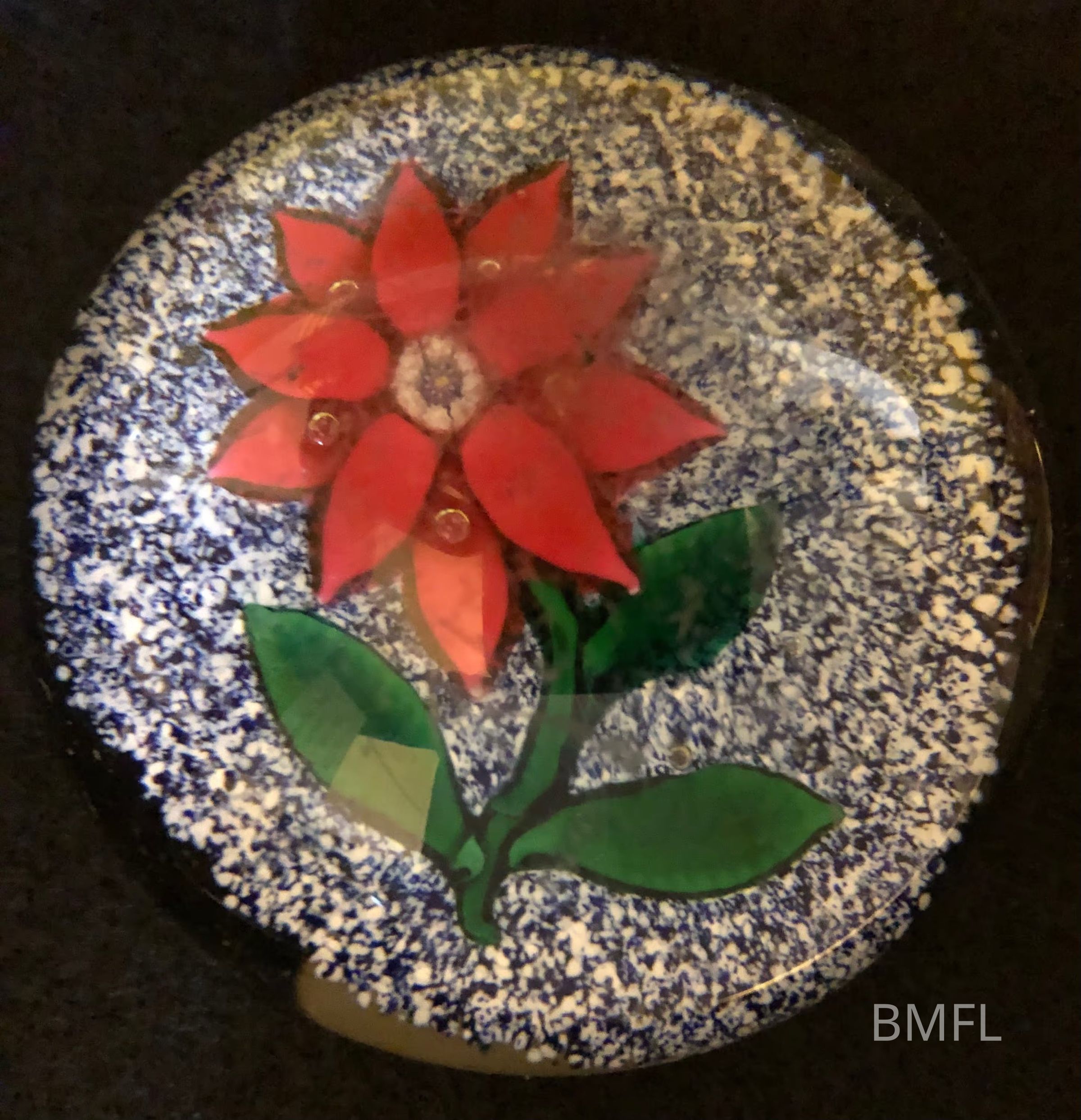Round glass paperweight with bright red flower against a mottled blue and white background.Use