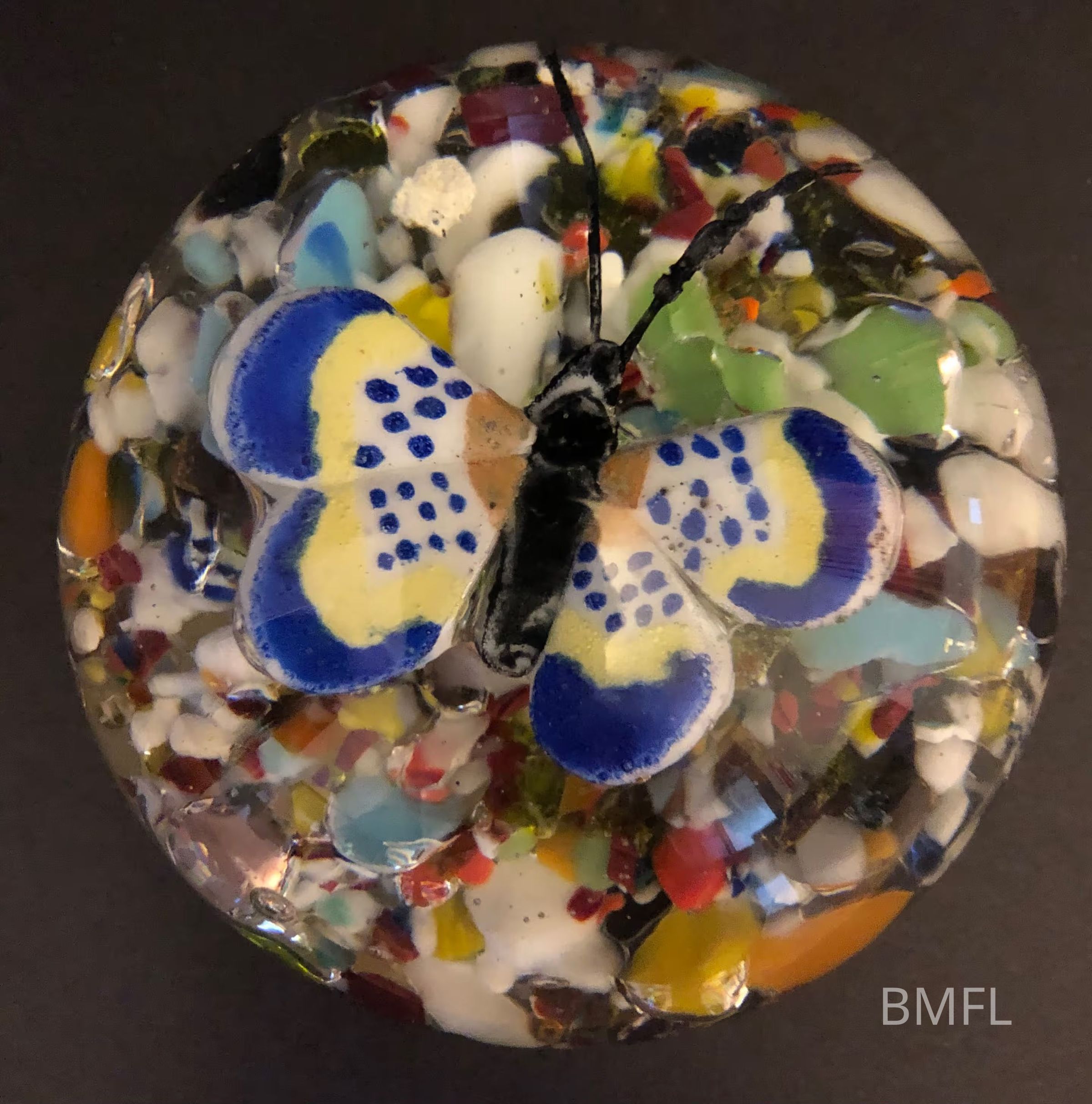 Round glass paperweight with brightly colored butterfly hovering over a large collection of multicolored chips.Use