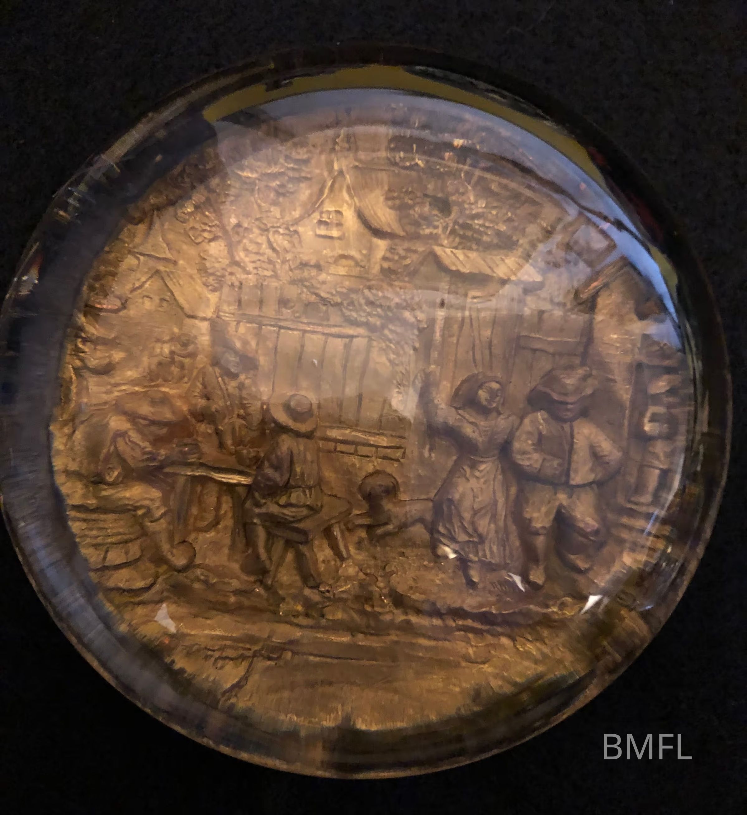 Glass paperweight with gold-colored carved scene showing people next to a cabin, some eating at a table, and some standing nearby. Unusual to this collection, as it has people, with a considerable amount of detail.Use