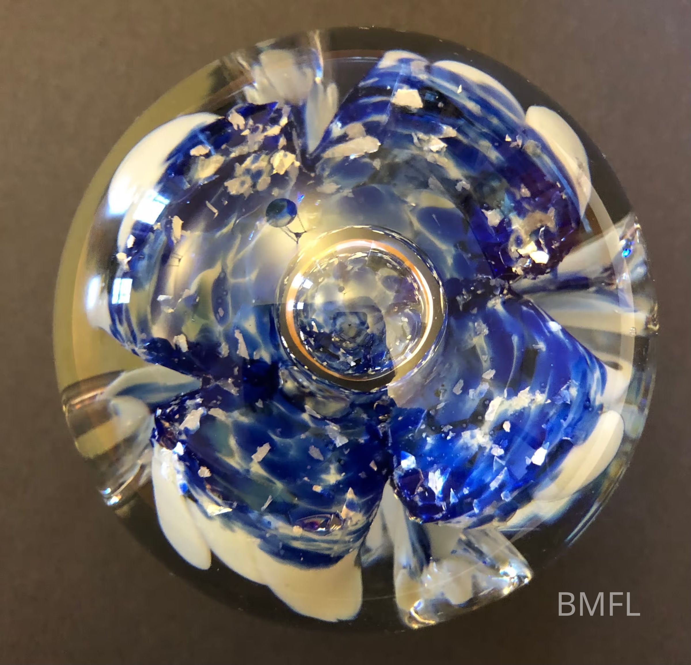 Round clear glass paperweight with large blue and white flower and large blown bubble in the center of the flower. Also decorative blown bubbles around the side.Use