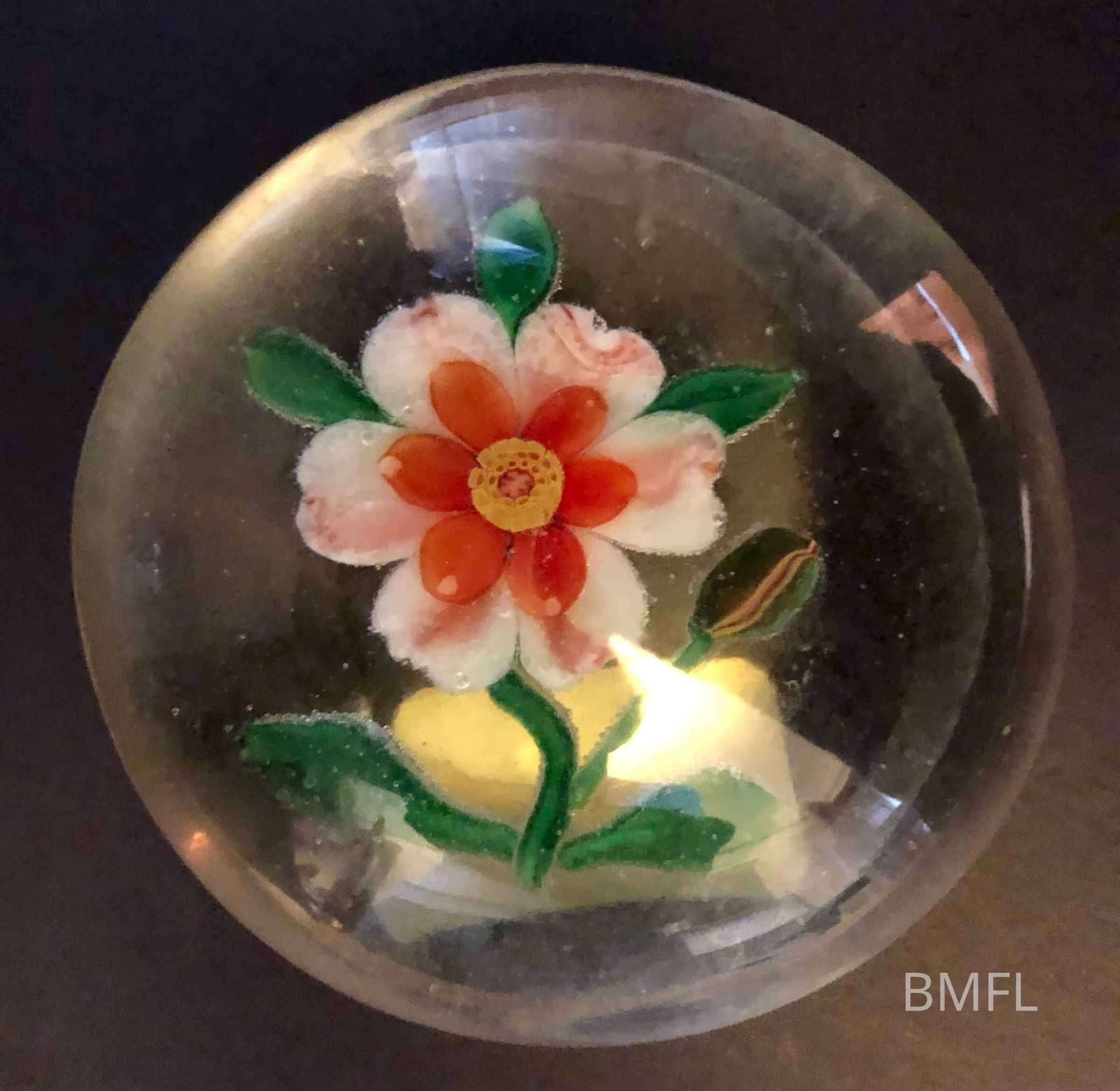 Round clear glass paperweight, half-filled with a layered red and pink/white flower and a bud, stem, and leaves. The flower is deceptively simple, as the different colored layers and the pink stripes on the white petals are not commonly found in nature.Use