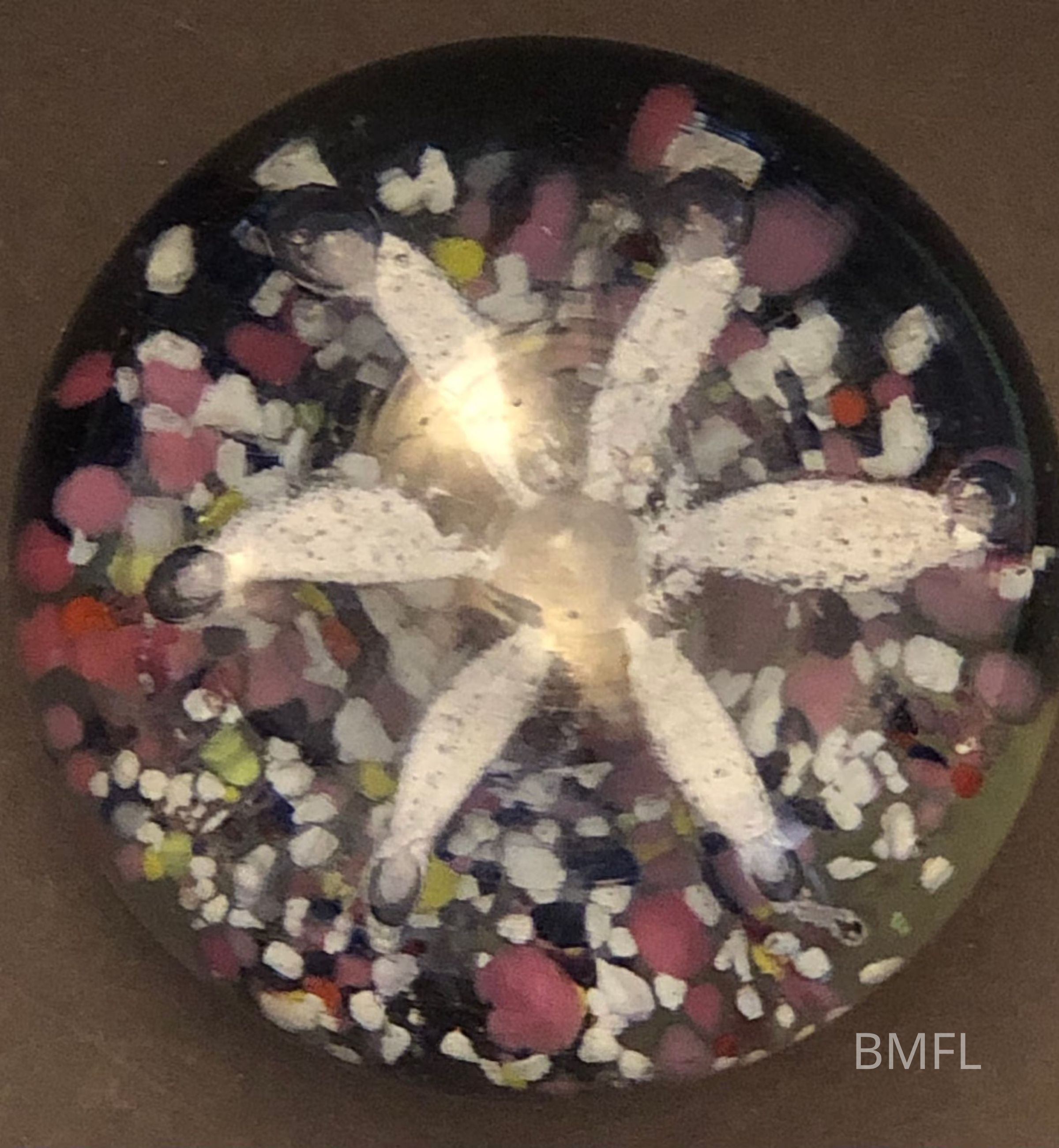 Round glass paperweight with large flower which is accented with small blown bubbles, over small multicolored chipsUse