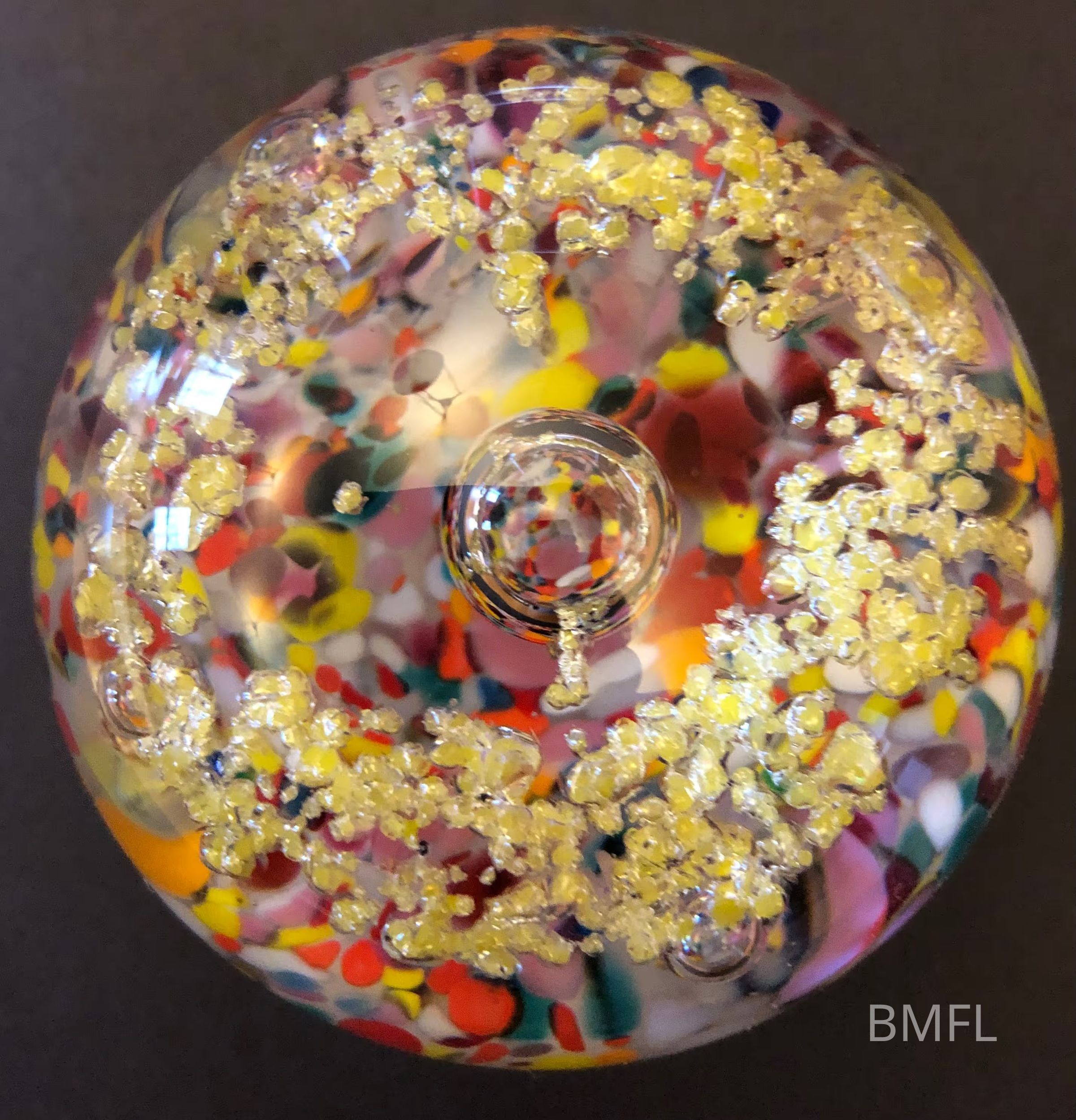 Round clear glass paperweight with a centered glass bubble in the top surrounded by tiny yellow pieces of glass. There are stems underneath the yellow glass, making up a larger flower, and then below those, a large mass of multicolored glass pieces.Use