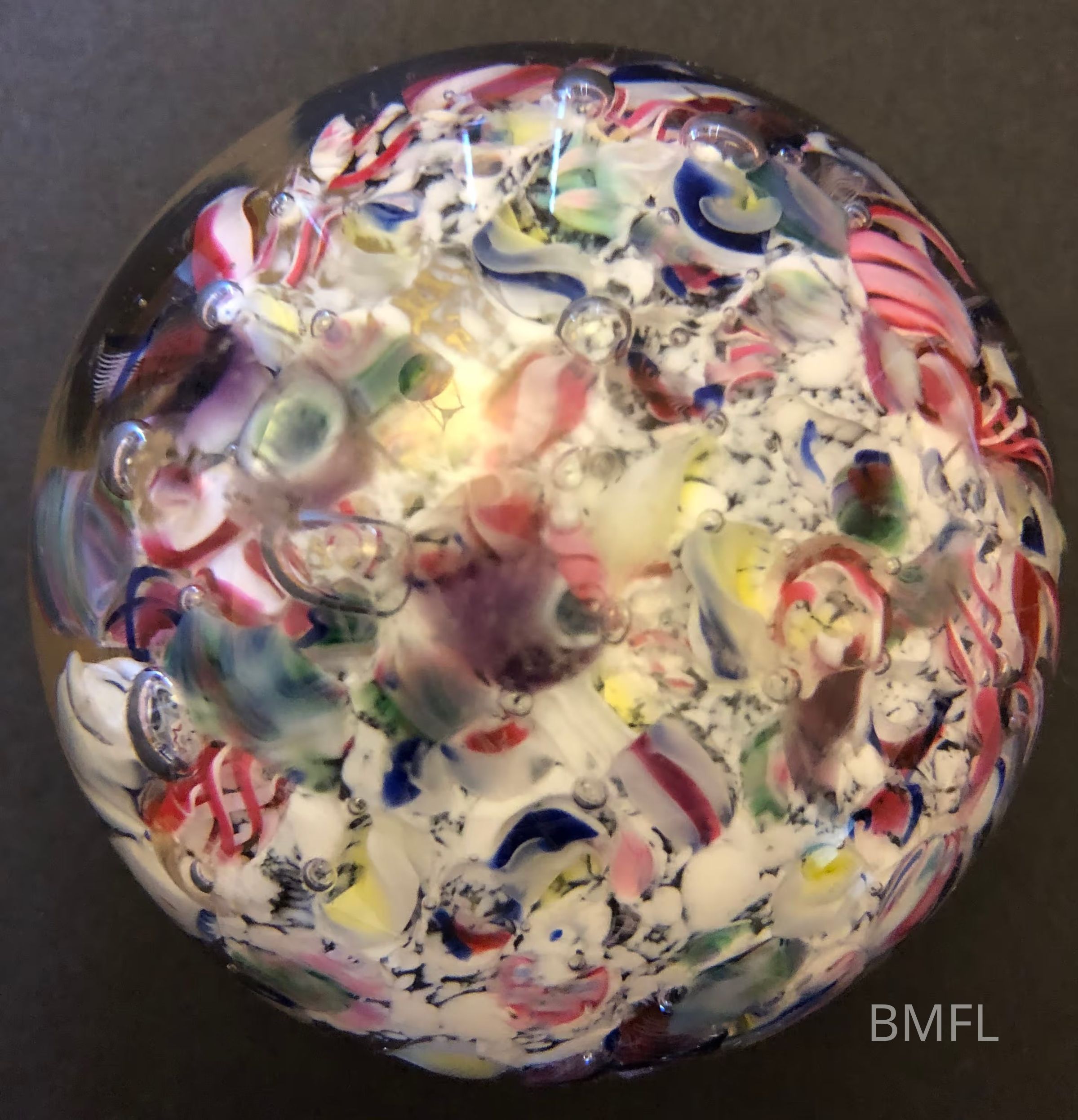 Round clear glass paperweight filled more completely than other paperweights of this category (filled with small colorful glass pieces). There are more white pieces amongst the glass, as well as some dark shaded pieces of glass, both of which make this a very different paperweight than some of the others filled with broken glass.Use