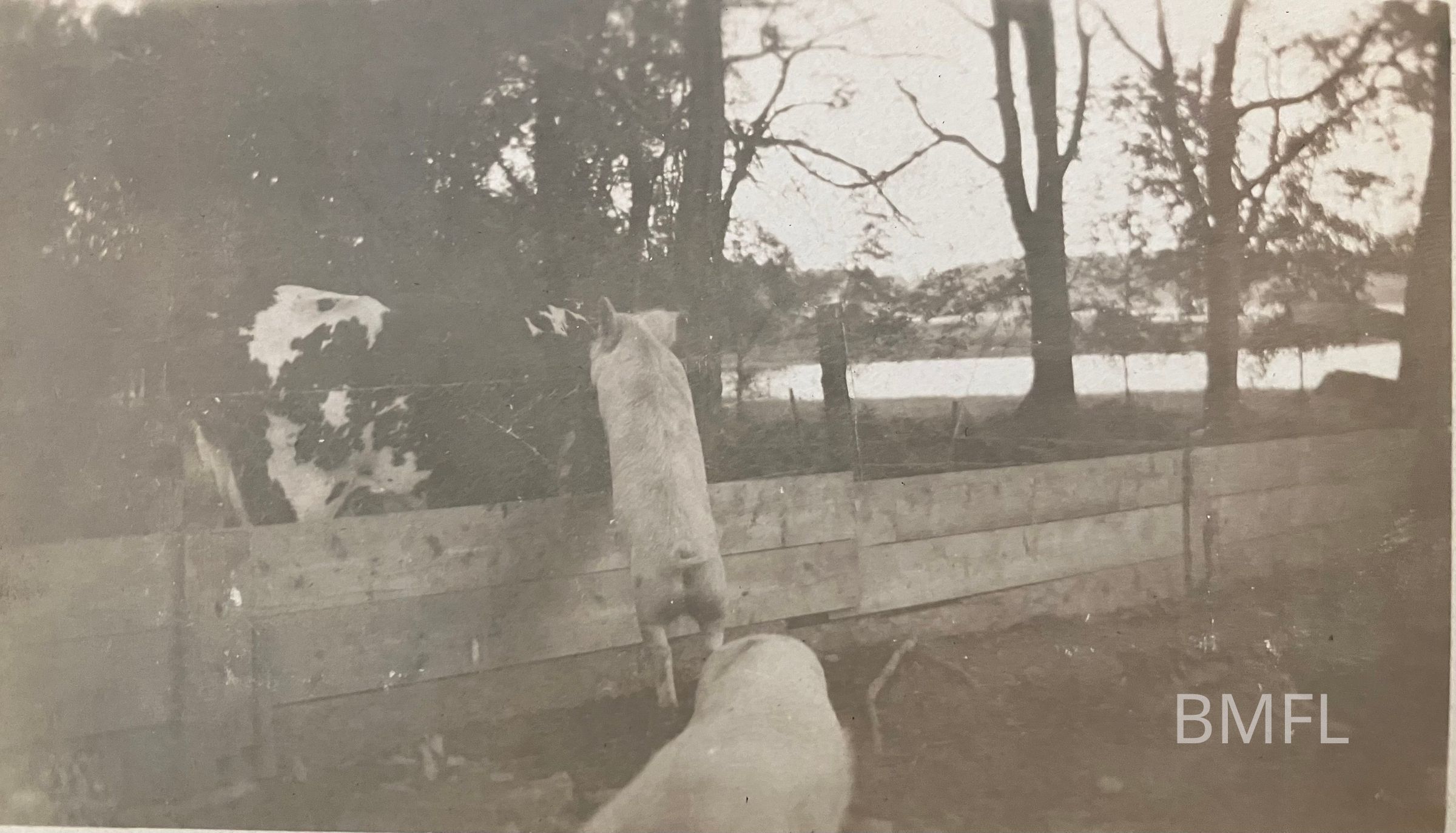 Two white pigs, with one on its hind legs along some boards with a cow on the other side.Photograph Details