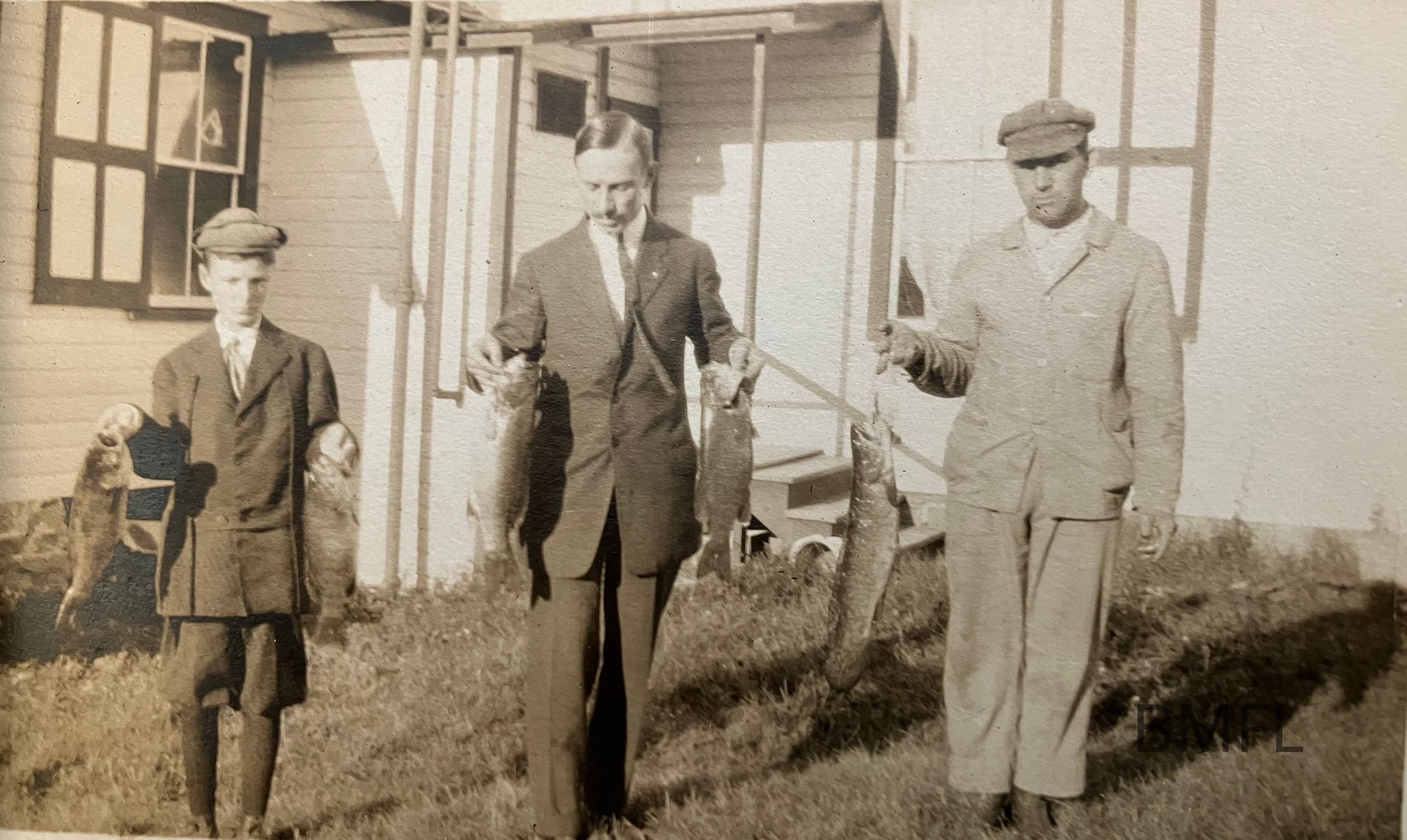 A boy and two men holding up fish.Photograph Details