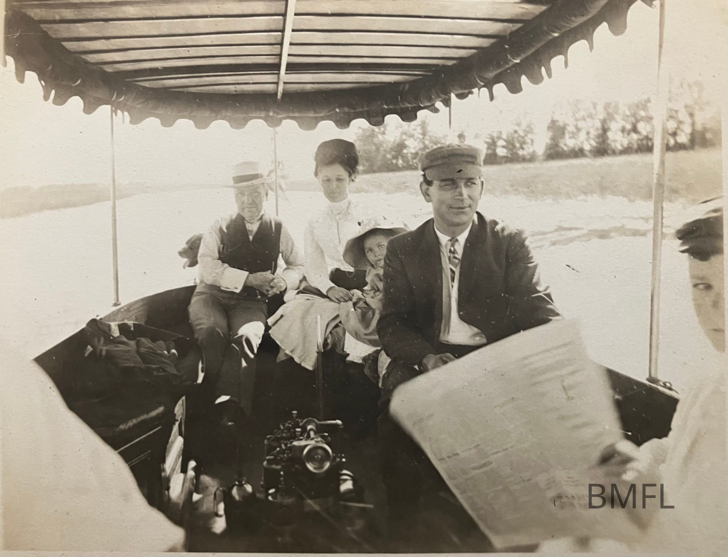 Two men, a woman, a young girl and a partial view of a boy in a boat with a canopy.Photograph Details