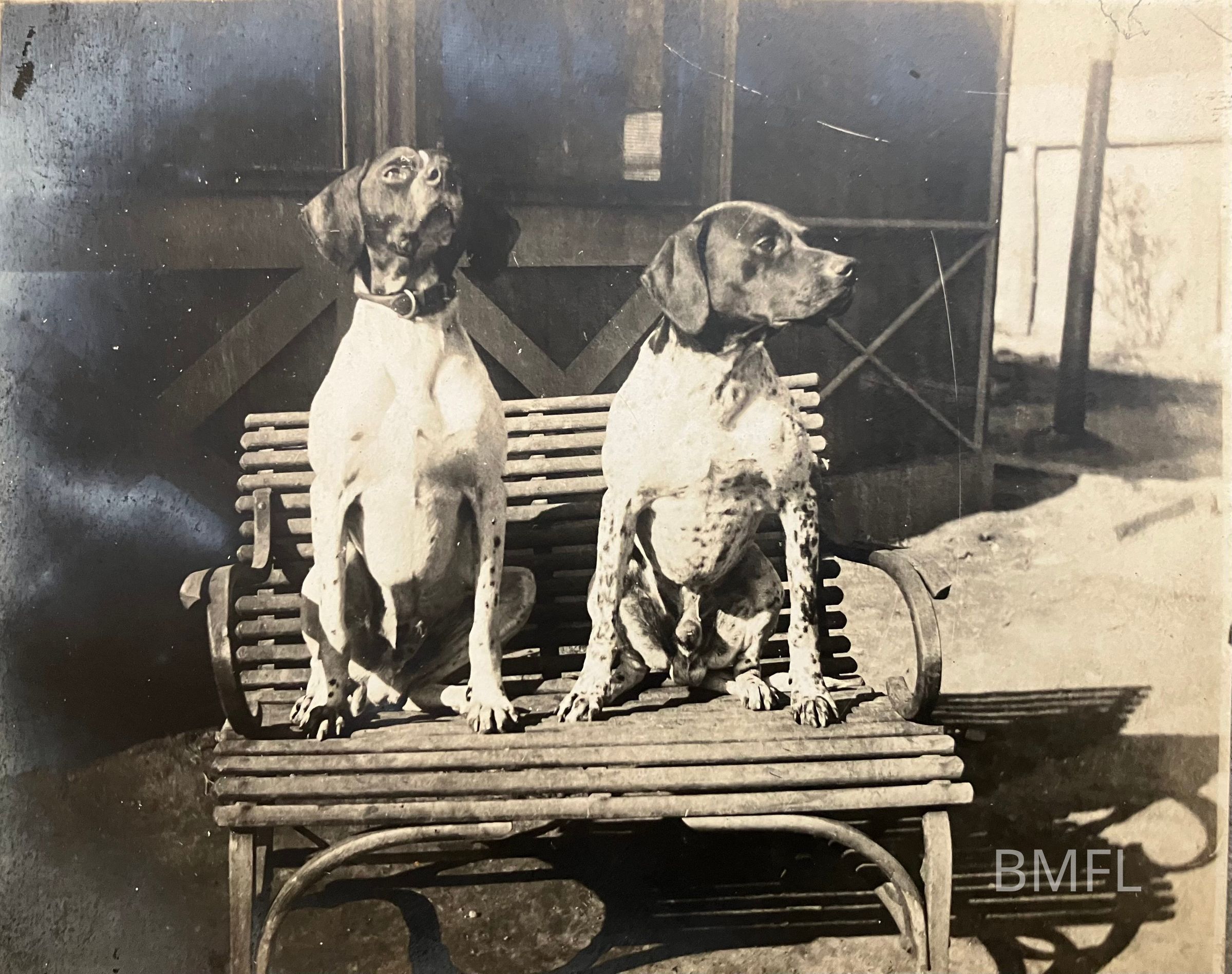 Two dogs sitting on a slatted, wooden benchPhotograph Details