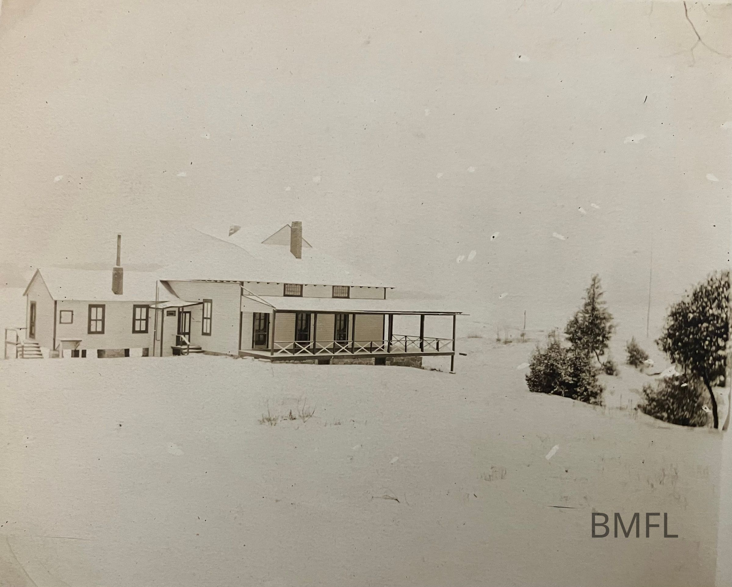 Cottage with a long porch surrounded by a snowy field.Photograph Details