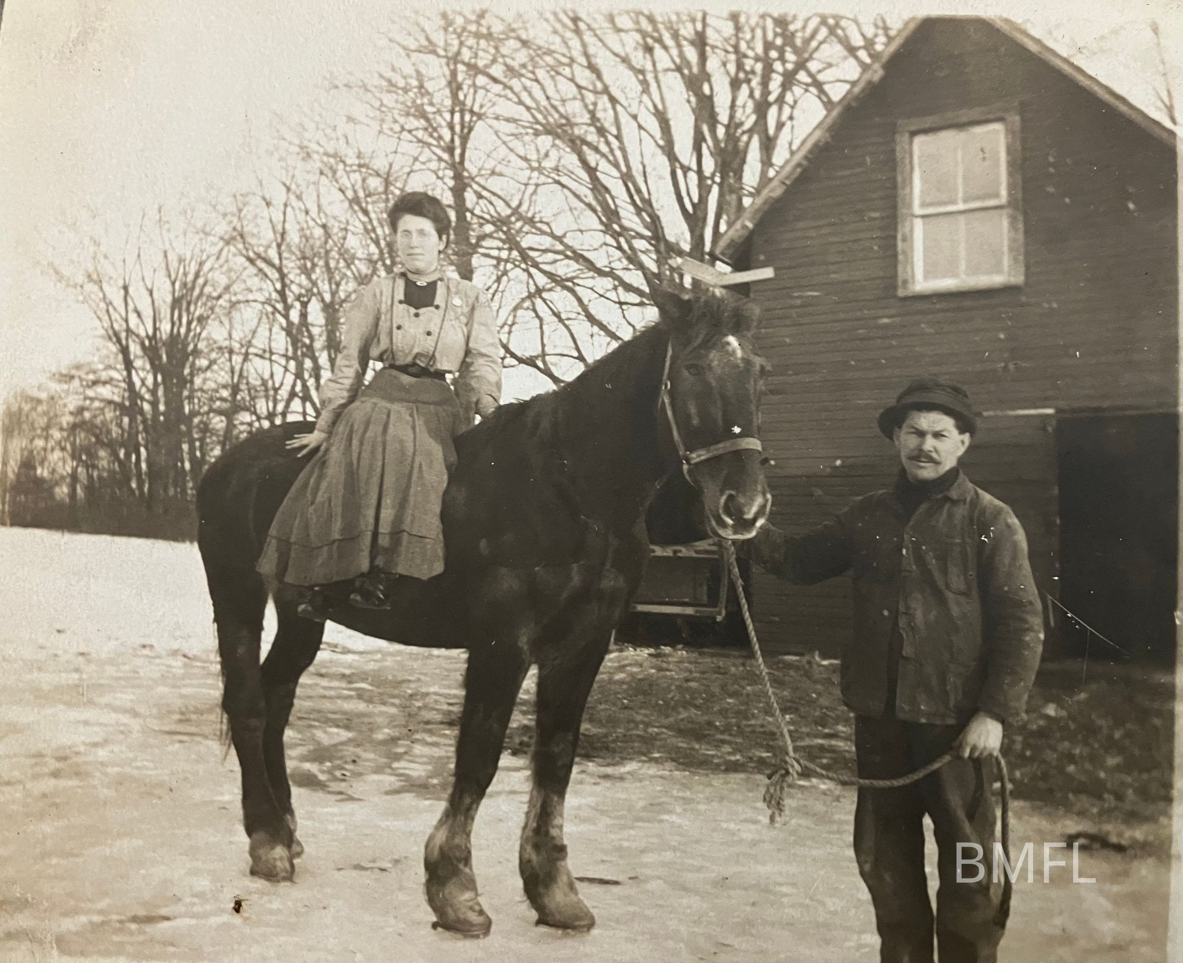 A woman sitting sideways on a horse held by a man. The ground looks snowy and there is a shed in the background.Photograph Details