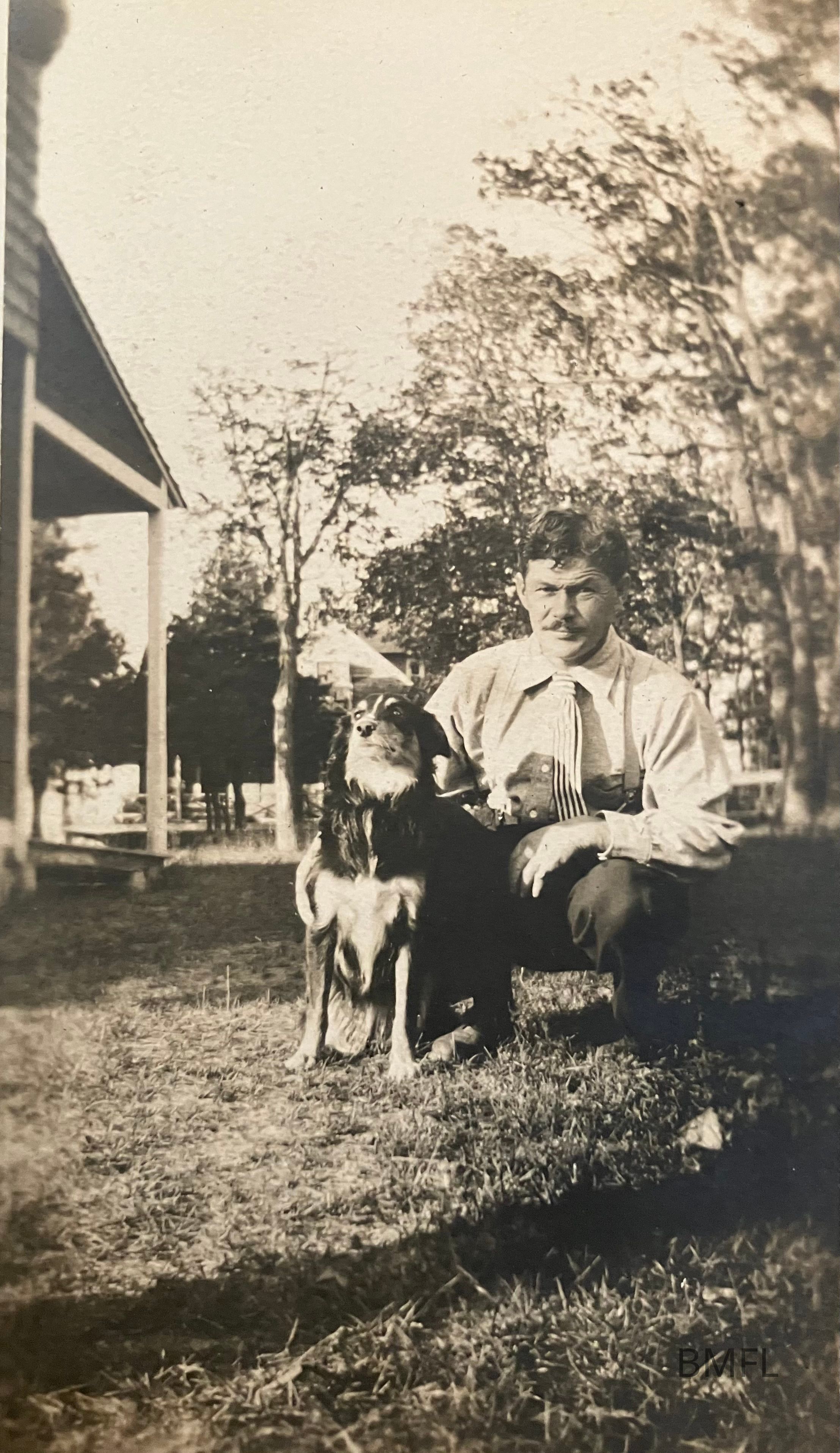 A man in a white shirt and striped tie crouched with a dog next to a housePhotograph Details