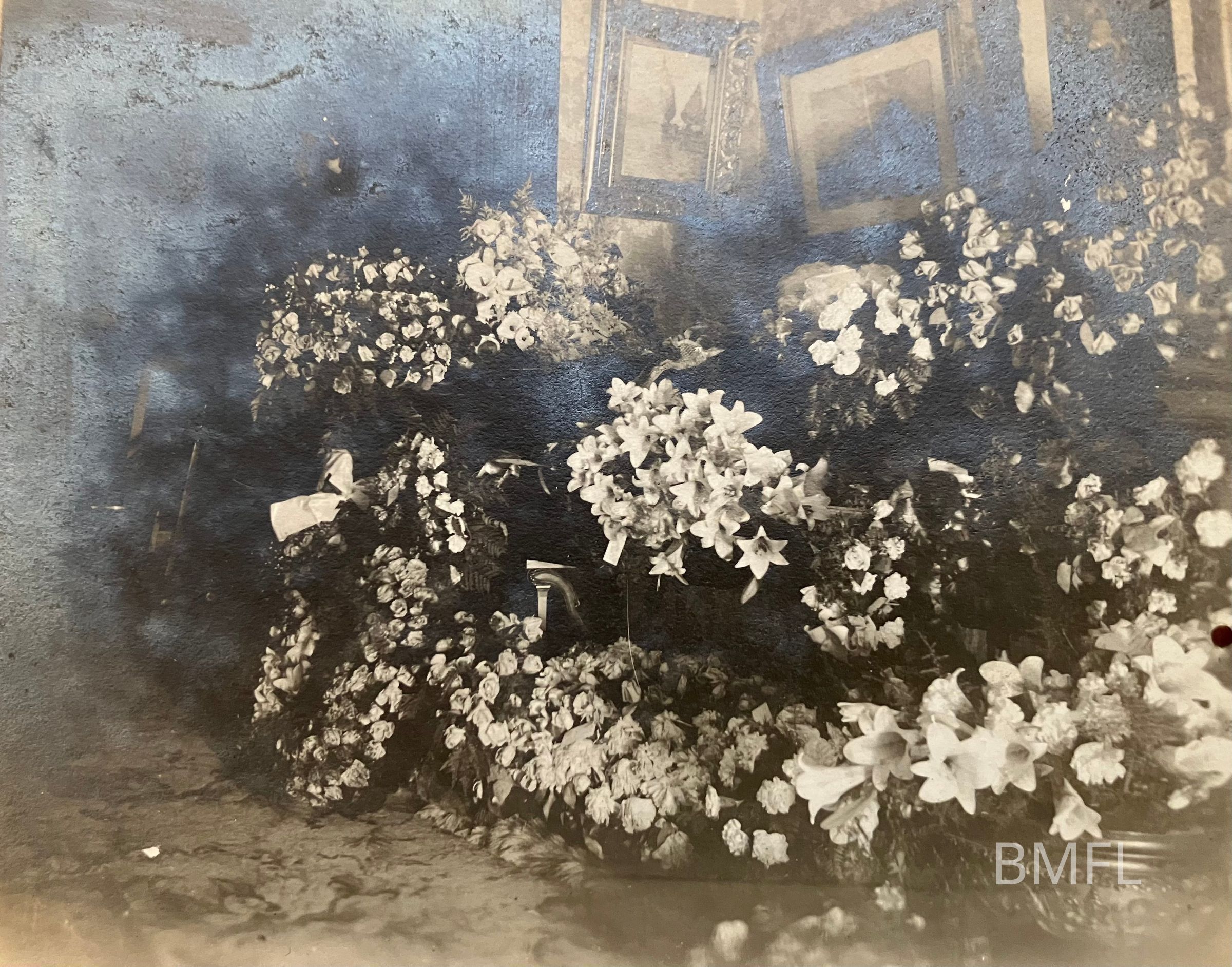Vases and wreaths of flowers with framed pictures in the backgroundPhotograph Details