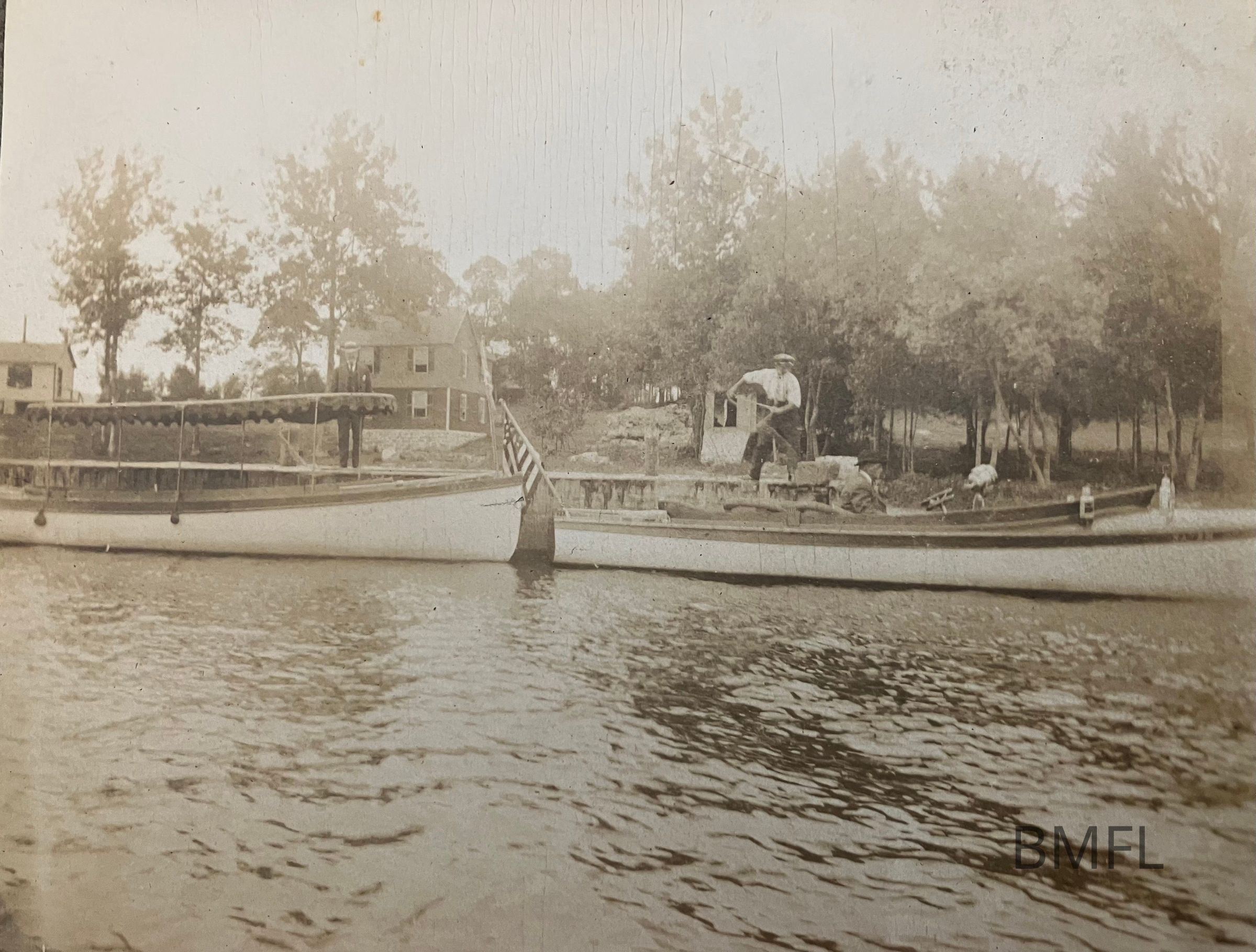 Two boats tied up at the dock at Fort Cassin and a man in a white short moving something.Photograph Details