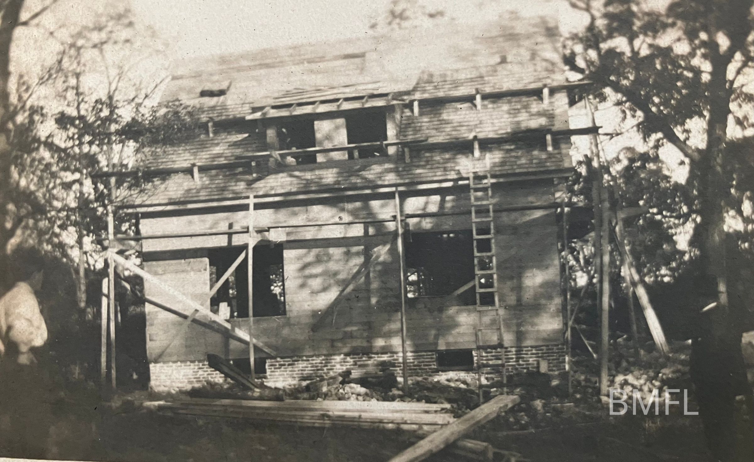 A cottage under construction with a man in the lower left corner.Photograph Details