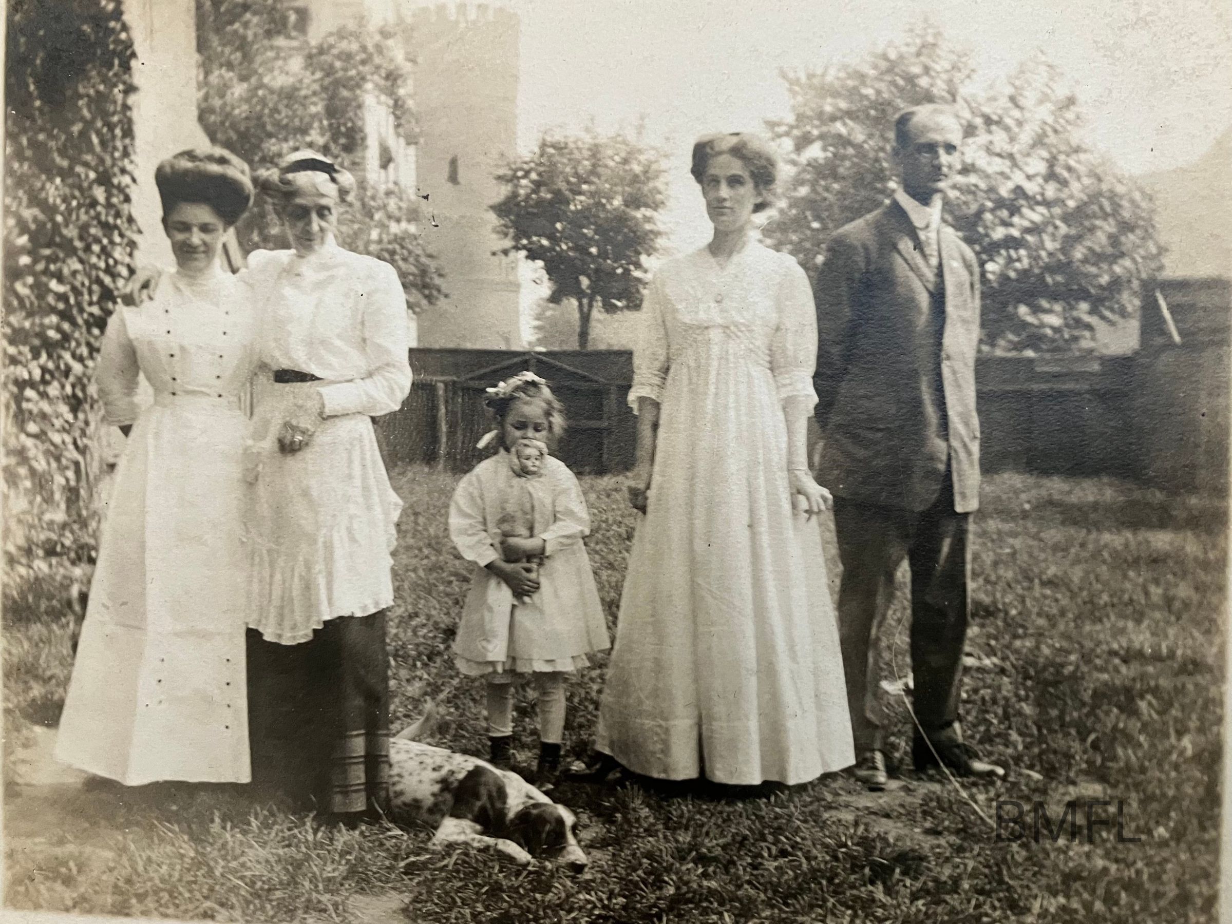 Three women, a young girl, a black and white dog and a manPhotograph Details