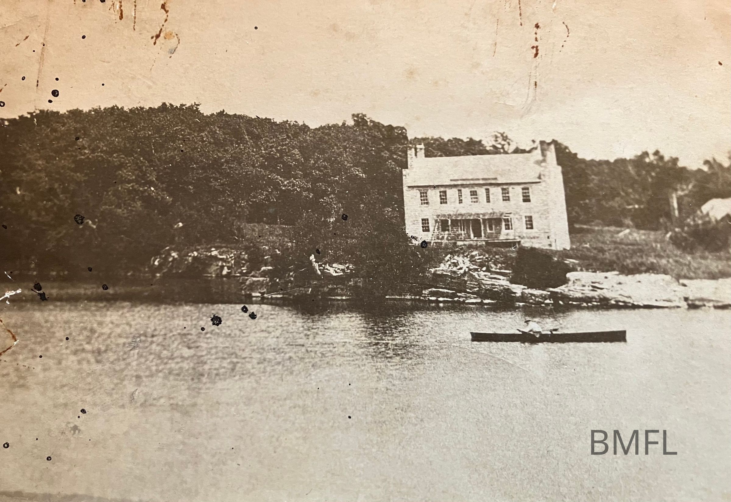 Hotel at the former site of Fort Cassin at the mouth of the Otter Creek. Someone in a canoe or rowing scull.Photograph Details