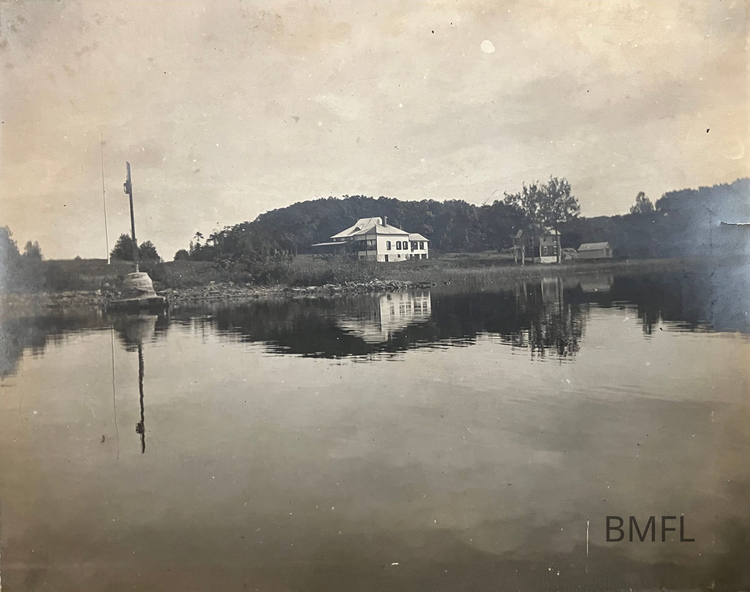 View from Lake Champlain/Otter Creek, looking at two cottages and a pole.Photograph Details