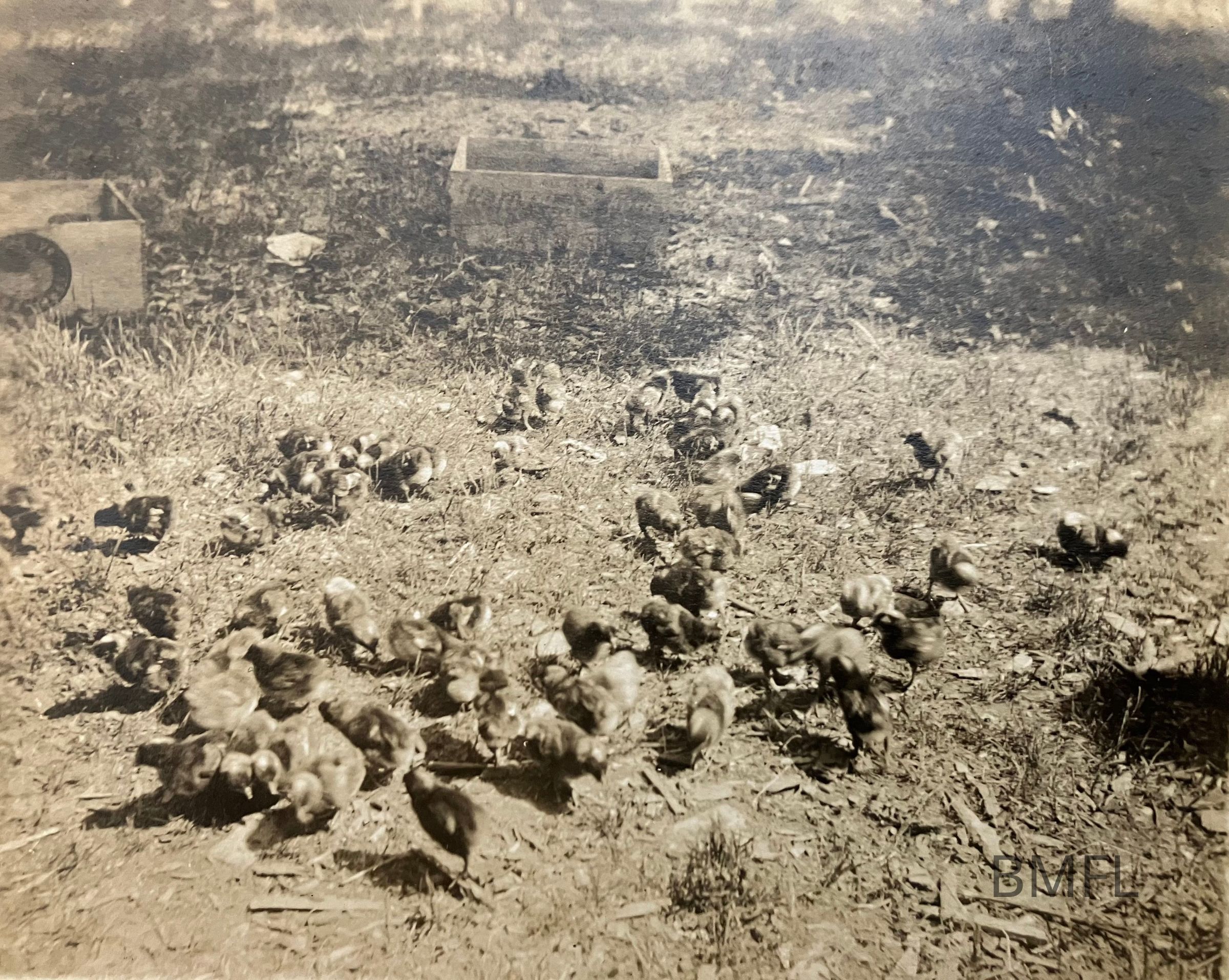 A couple dozen chicks peck the groundPhotograph Details