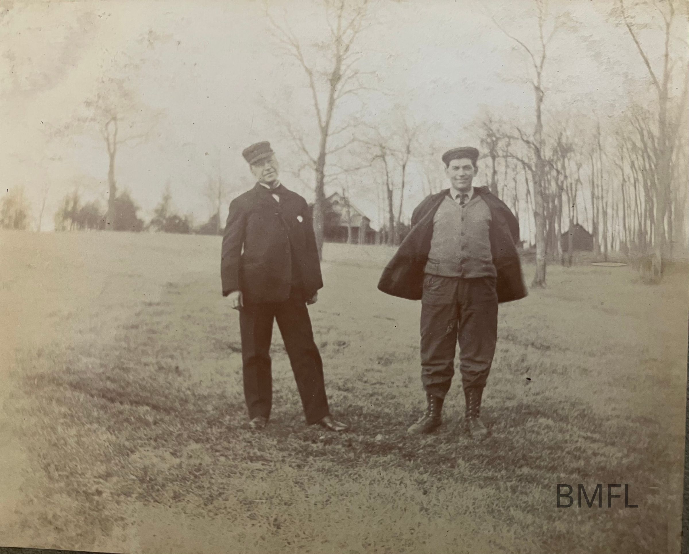Two men standing in a field with barren trees and several buildings in the backgroundPhotograph Details