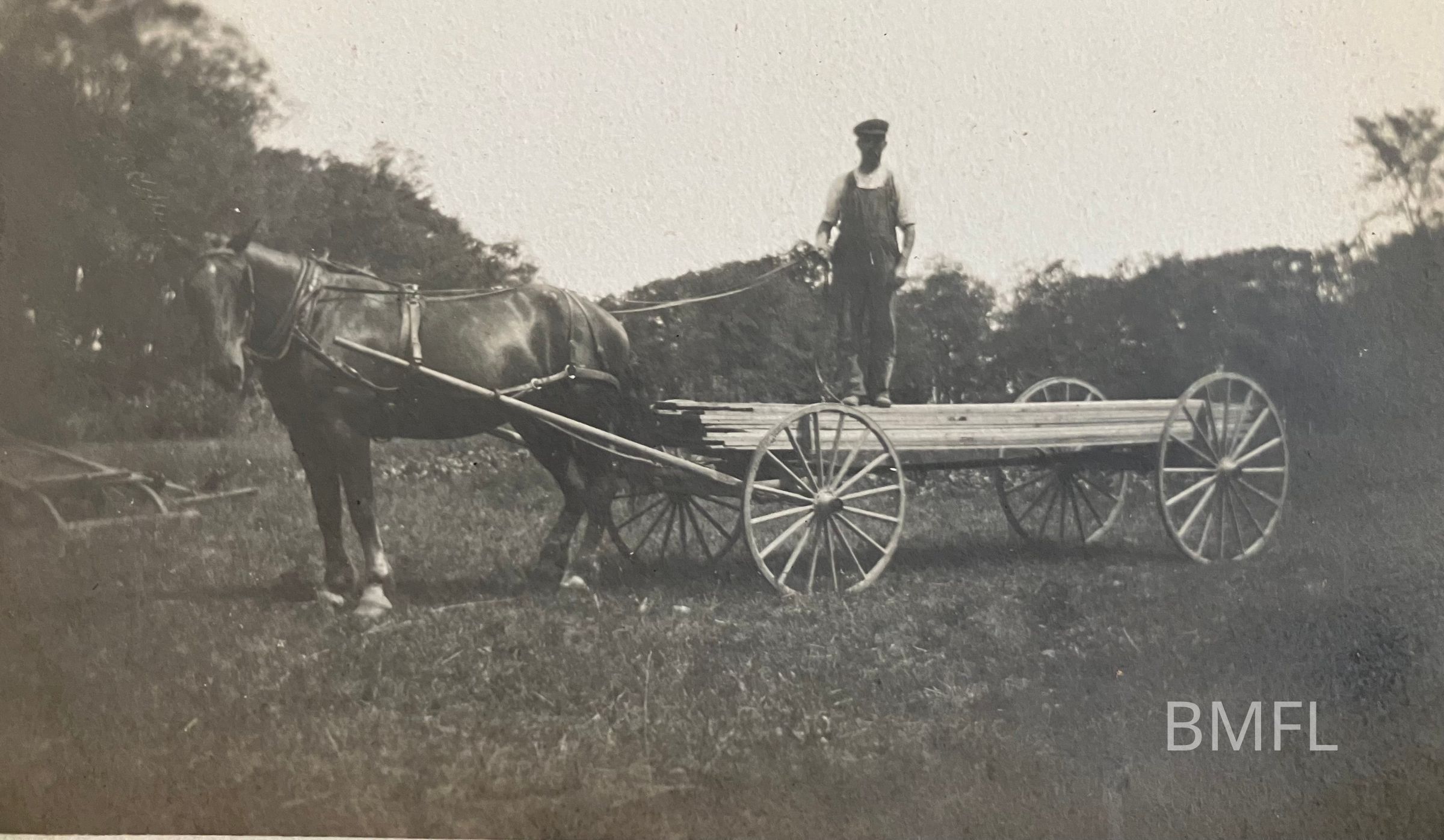 A man in overalls, white shirt and a hat standing on lumber in a wagon pulled by a horse.Photograph Details