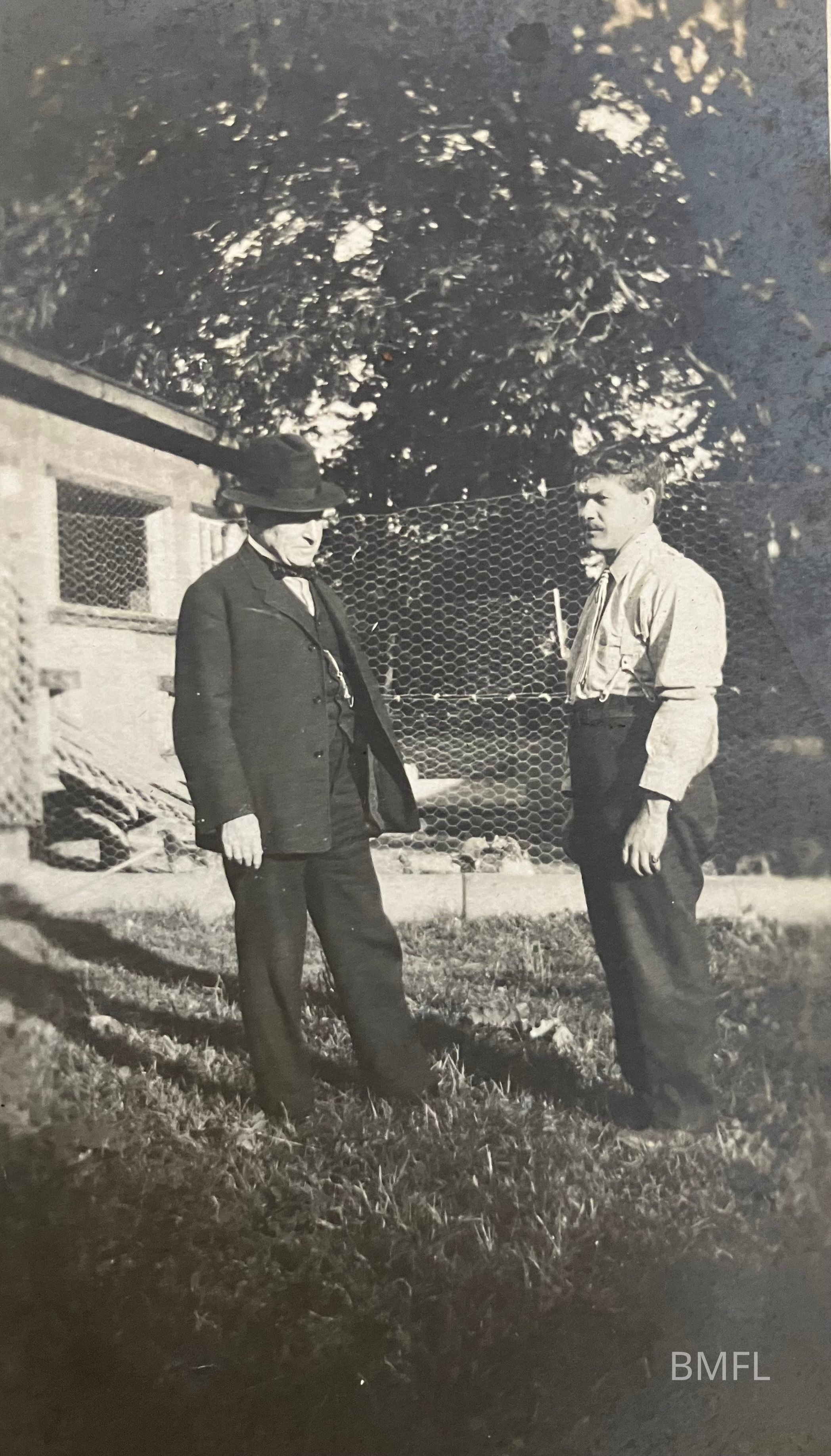 A man in a dark suit and hat standing with a man in a shirt, tie and high pants by a shedPhotograph Details