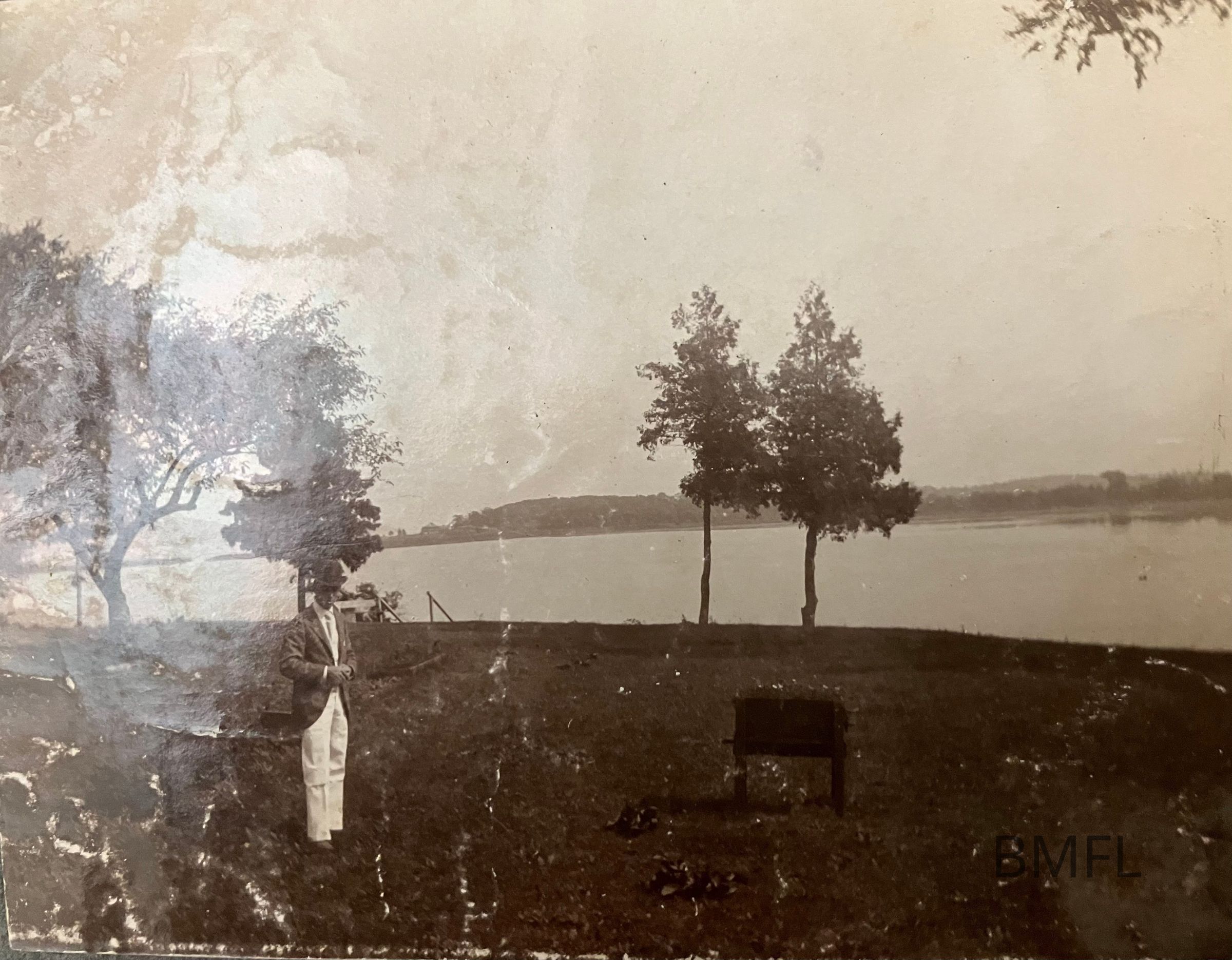 A man in white pants, a jacket, tie and hat on the shore near Fort CassinPhotograph Details