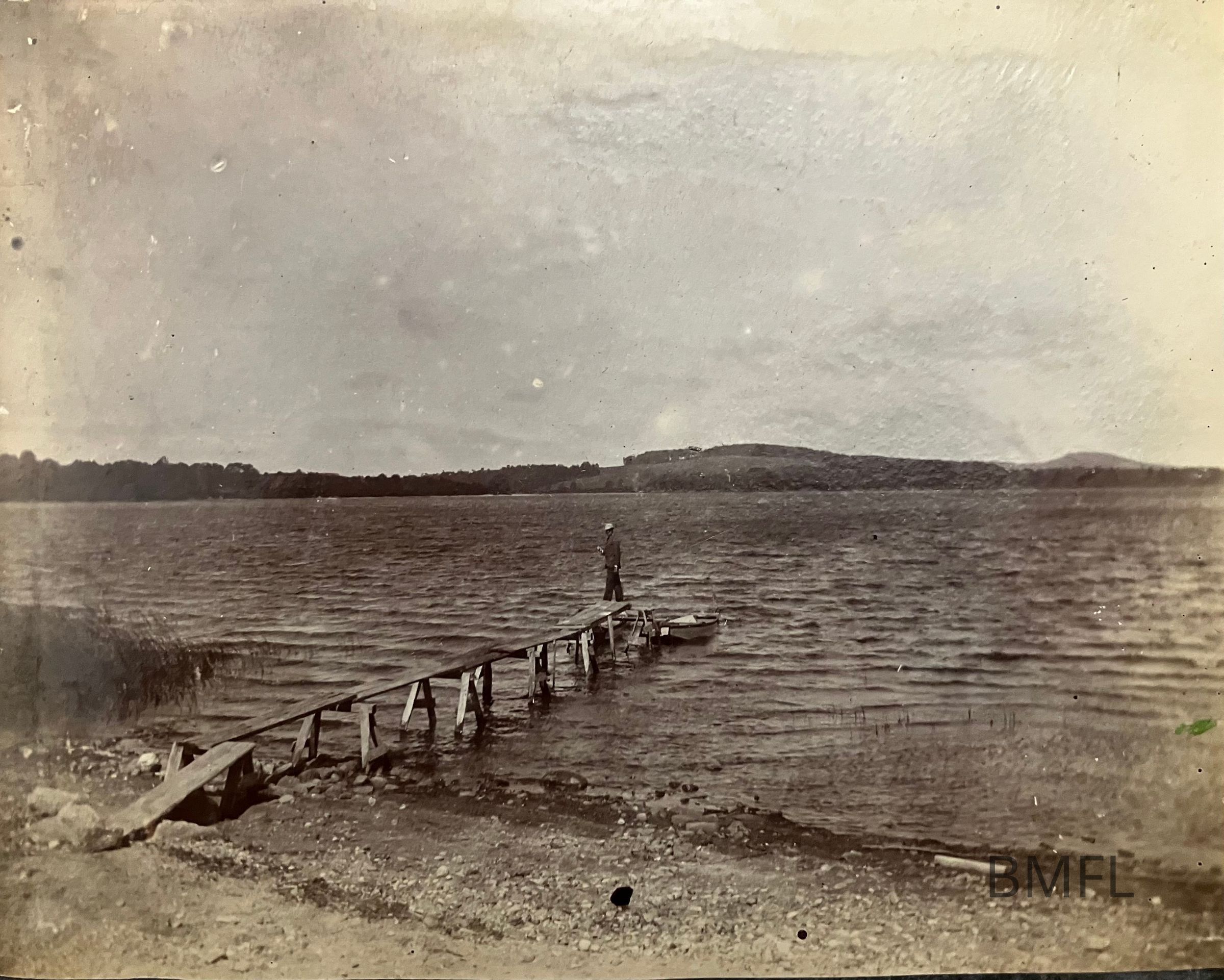 A man stands at the end of a dock made of saw horses and planks.Photograph Details