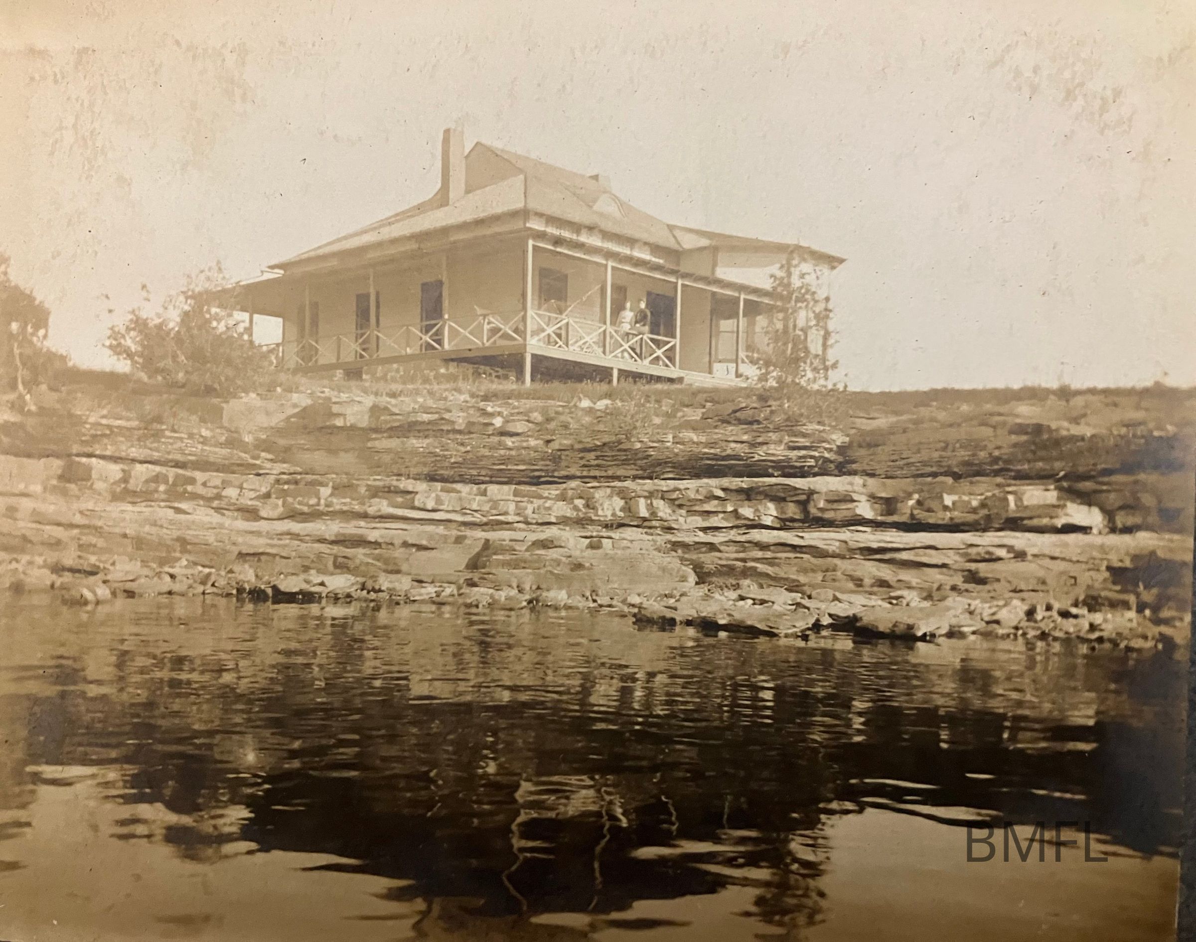 A cottage with a wrap-around porch sitting above a ledge-edged shore.Photograph Details