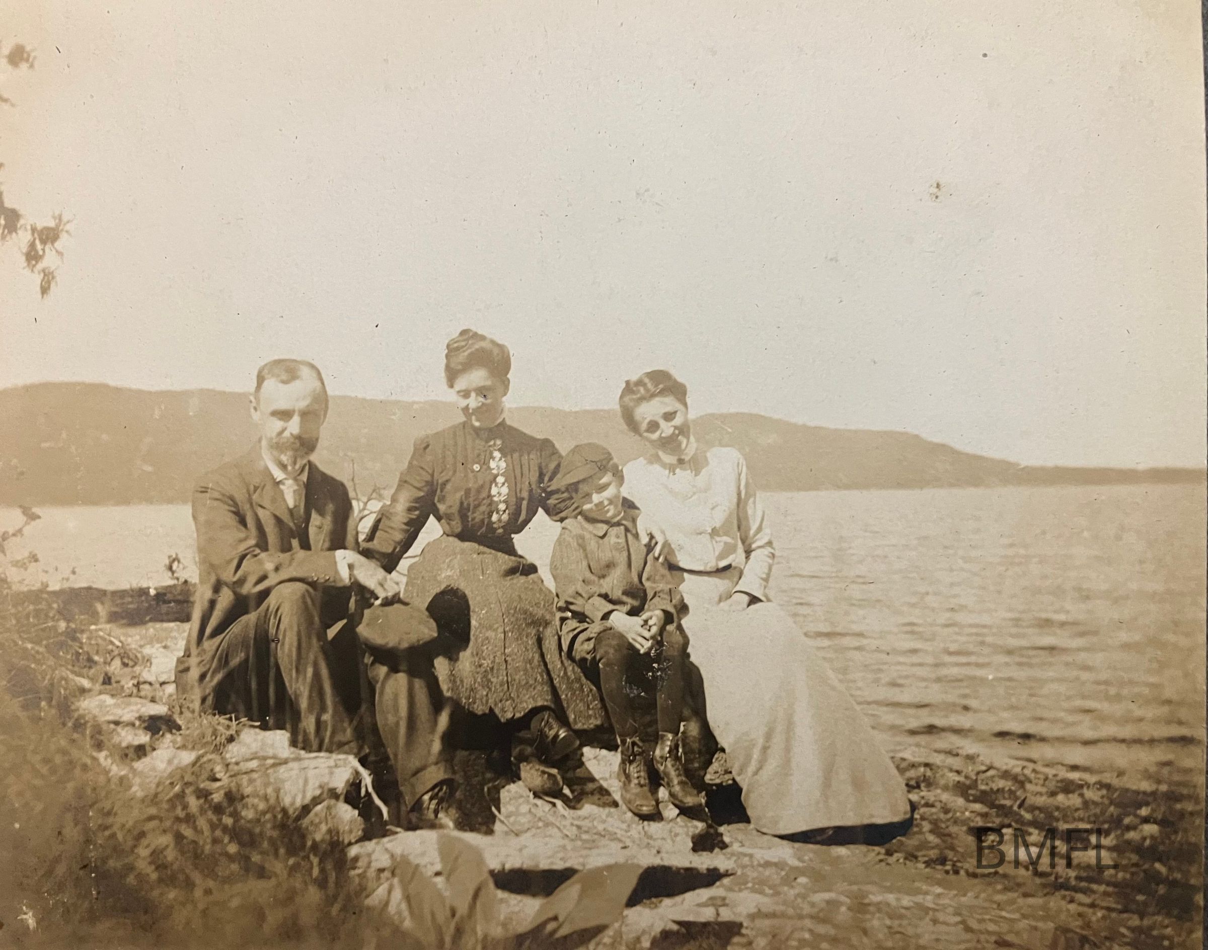 Family of four sits on rocks on the shore at Fort CassinPhotograph Details