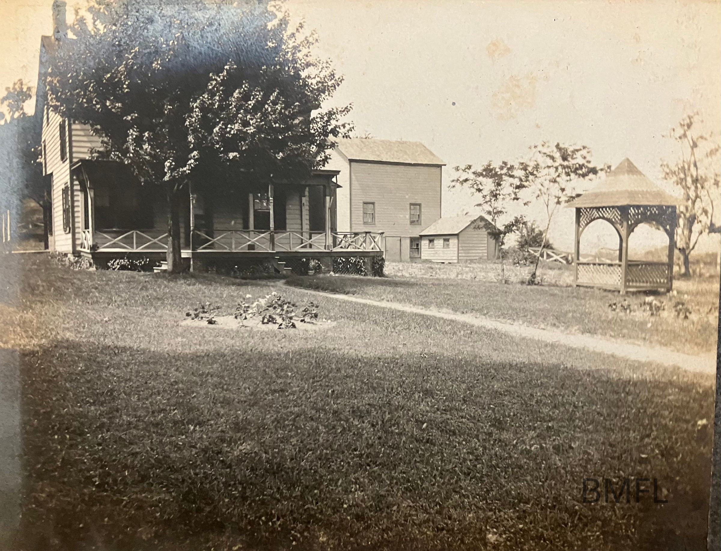 A cottage with a porch in front of another building and near a small gazebo.Photograph Details