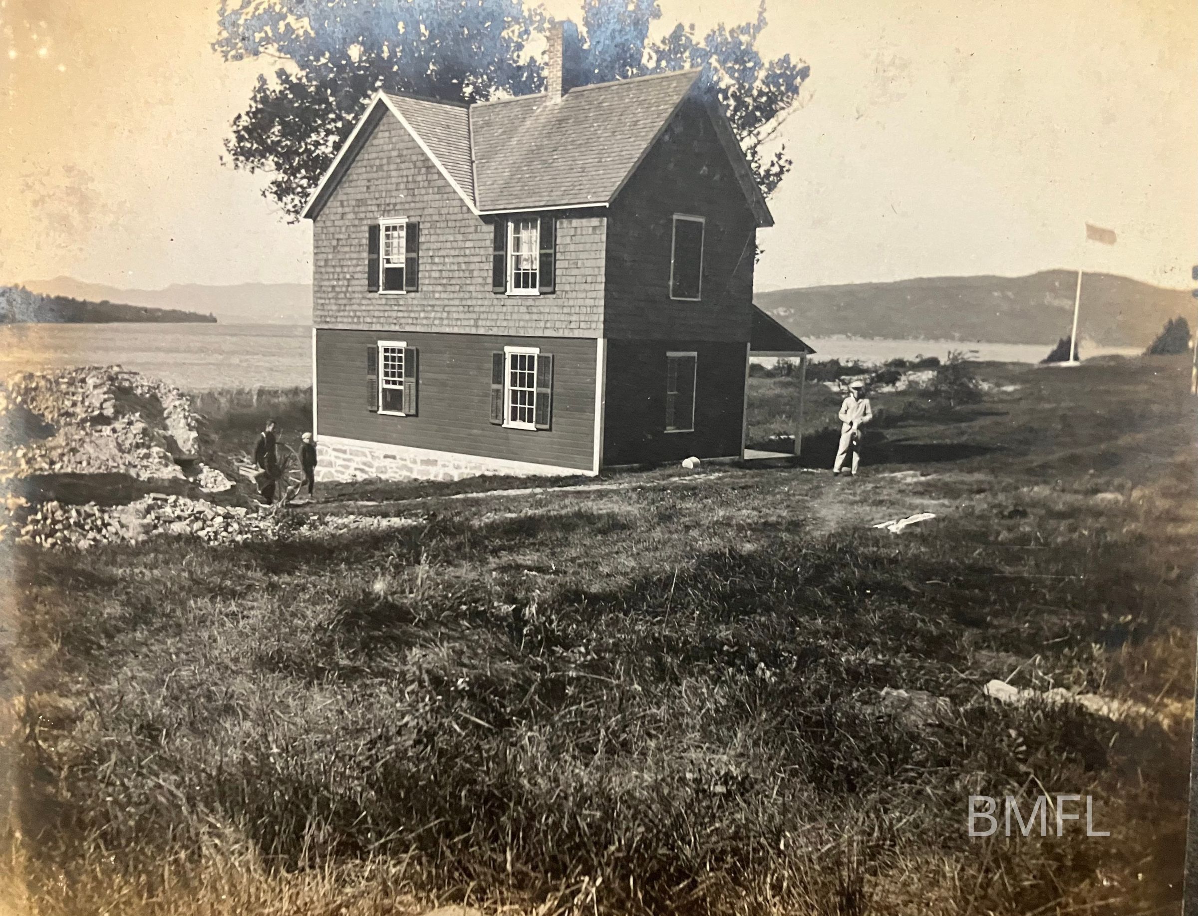 A two-story cottage with a man in a light-colored suit standing next to it and two other people standing on the other side of the building. A flag-pole and Lake Champlain are visible in the distance.Photograph Details