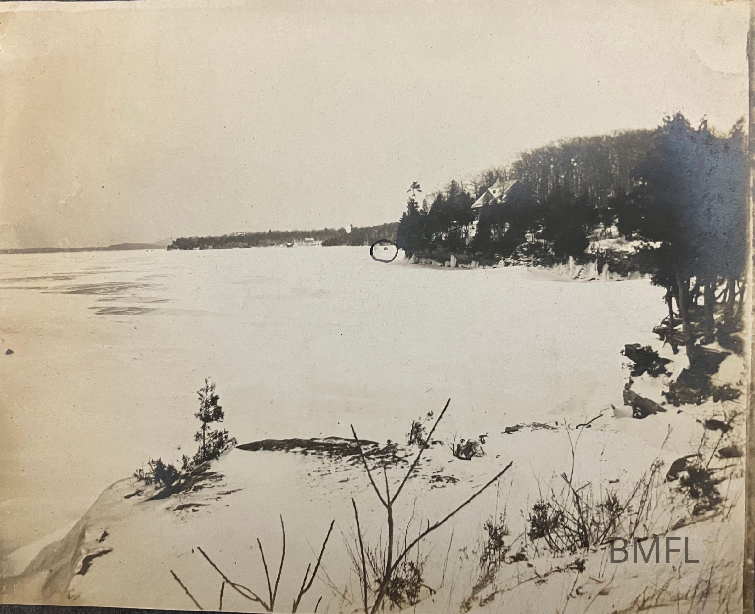 Frozen, now-covered Lake Champlain with a dot -- an ice shanty--in the distance that has been circled with a pen.Photograph Details