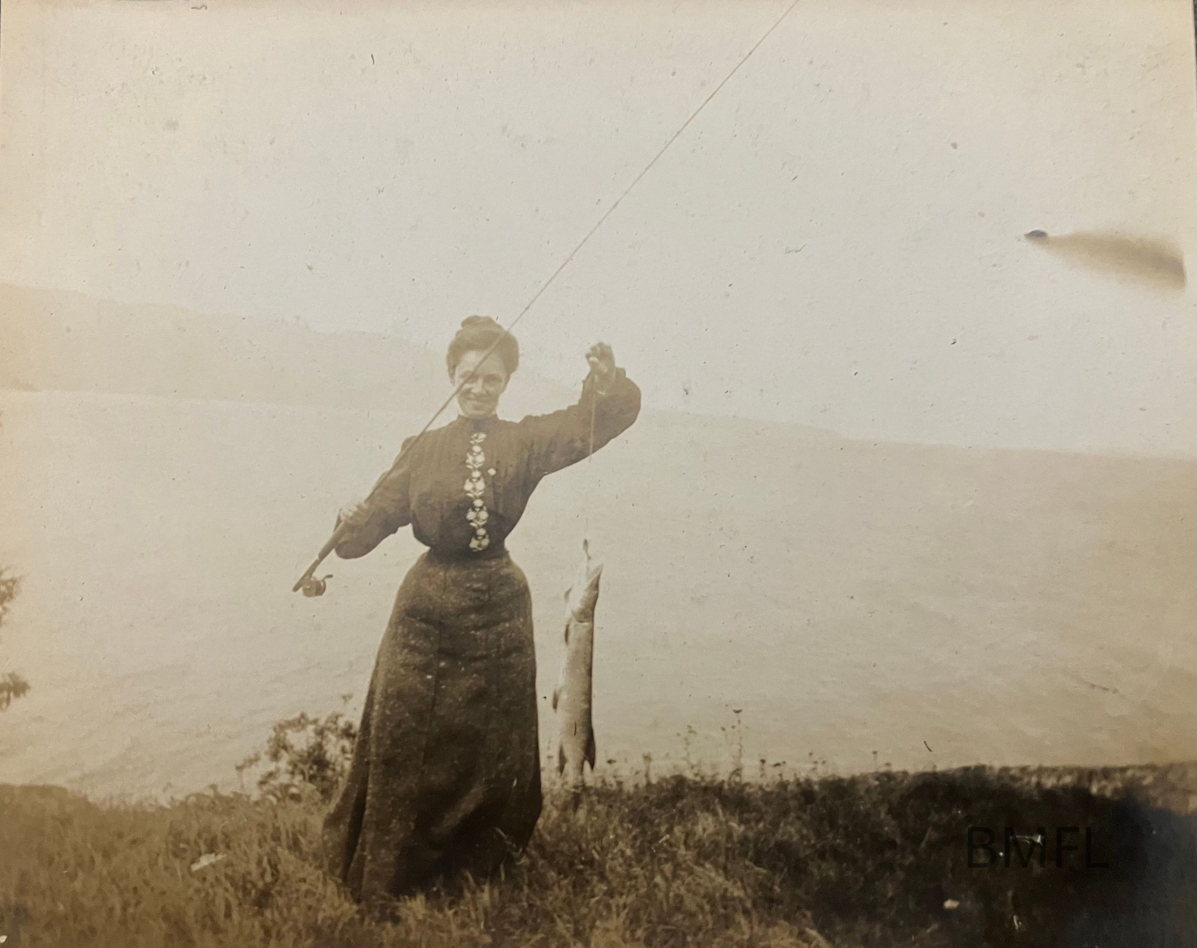 Woman in a long-sleeved blouse and skirt stands on shore with a long fish and fishing rod.Photograph Details