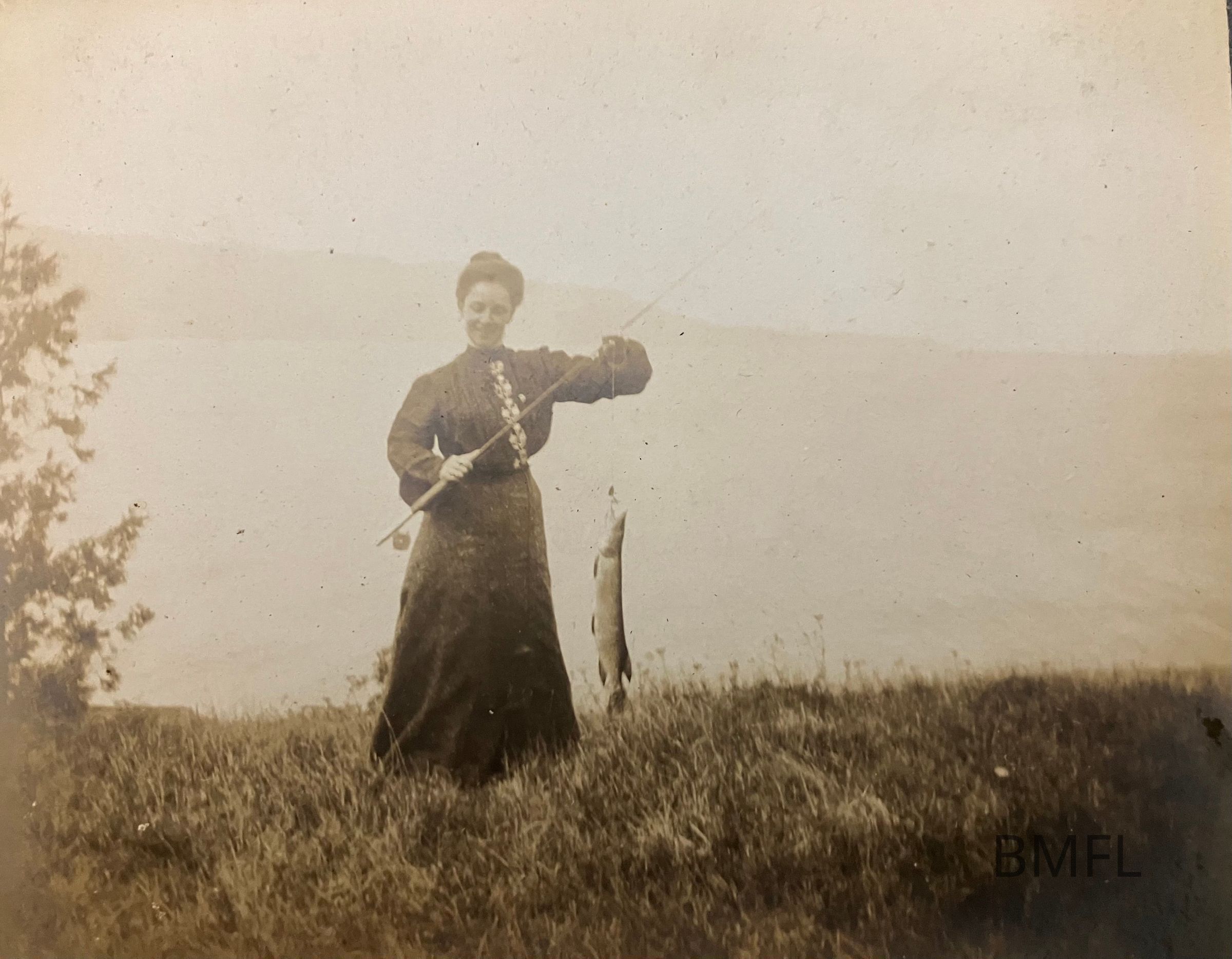 Woman in a long-sleeved blouse and skirt stands on shore with a long fish and fishing rod.Photograph Details