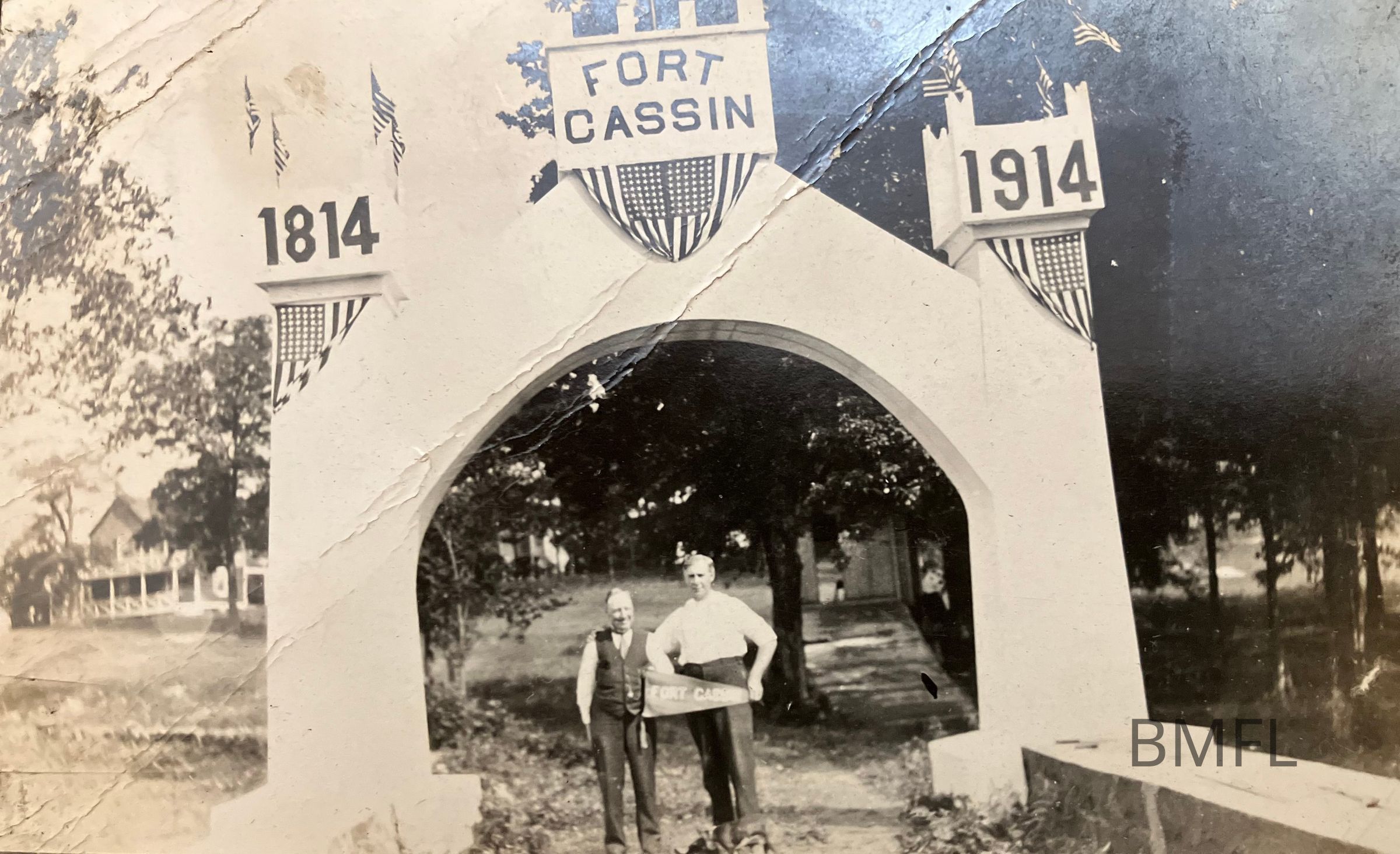 Two men stand under an arch erected to celebrate the centennial of Fort CassinPhotograph Details