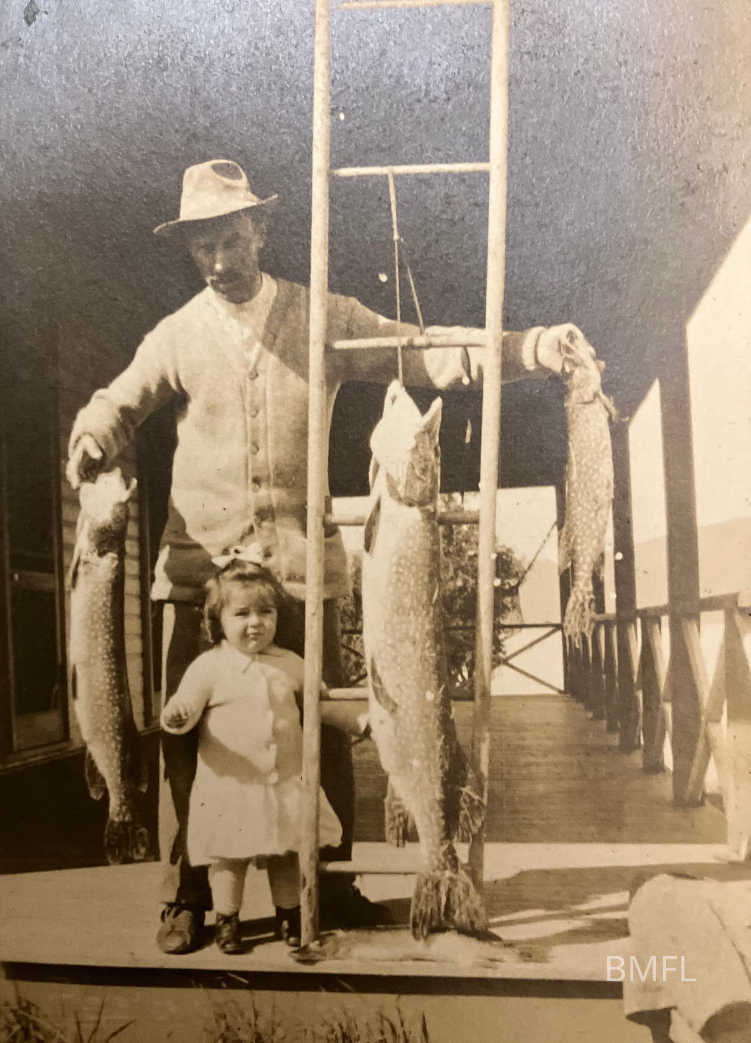 Man in a hat and sweater holding two big fish with a bigger one hanging from a ladder -- all longer than the toddler standing in front.Photograph Details