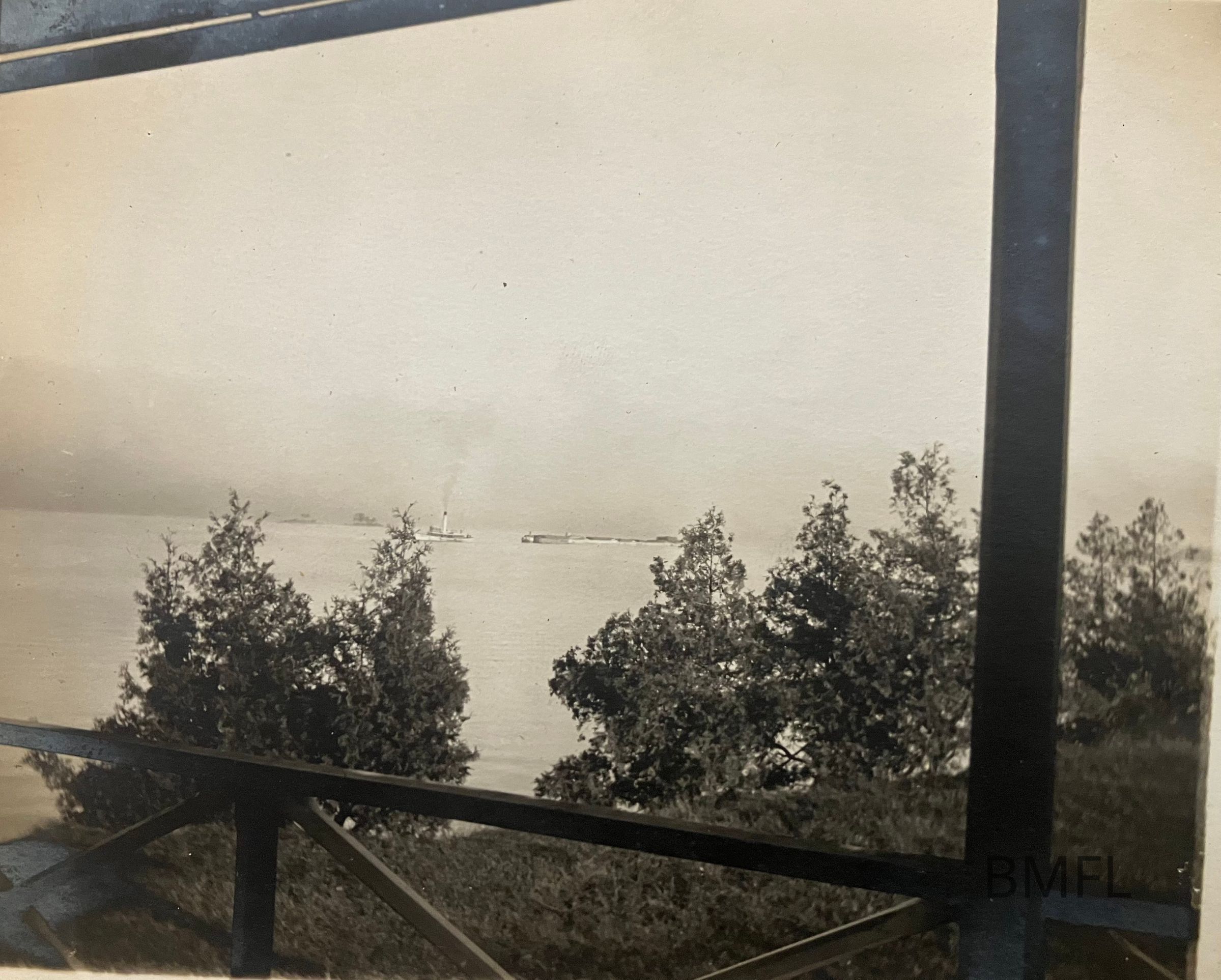 View from Lake Champlain from a porch with a steamboat pulling a barge in the distance.Photograph Details