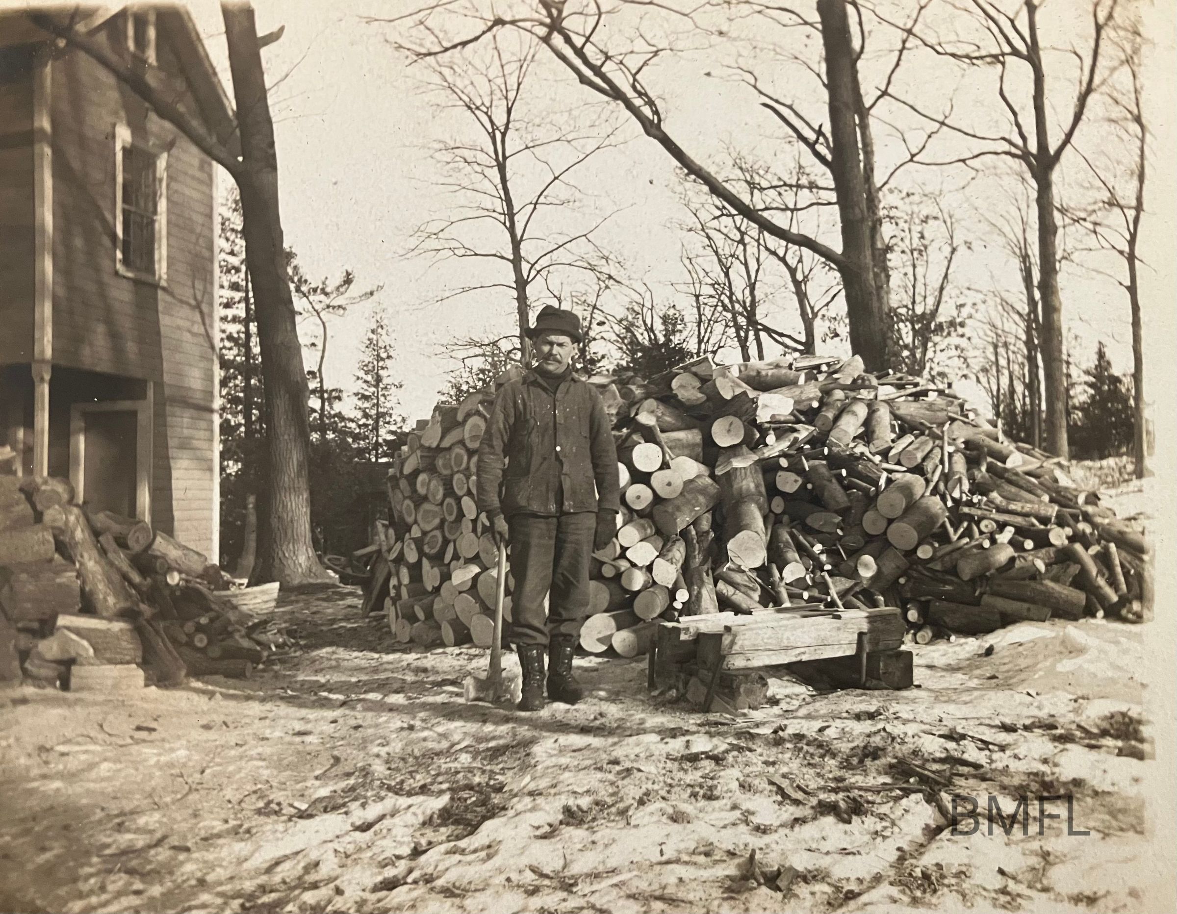 Man standing with an axe in front a large pile of wood.Photograph Details