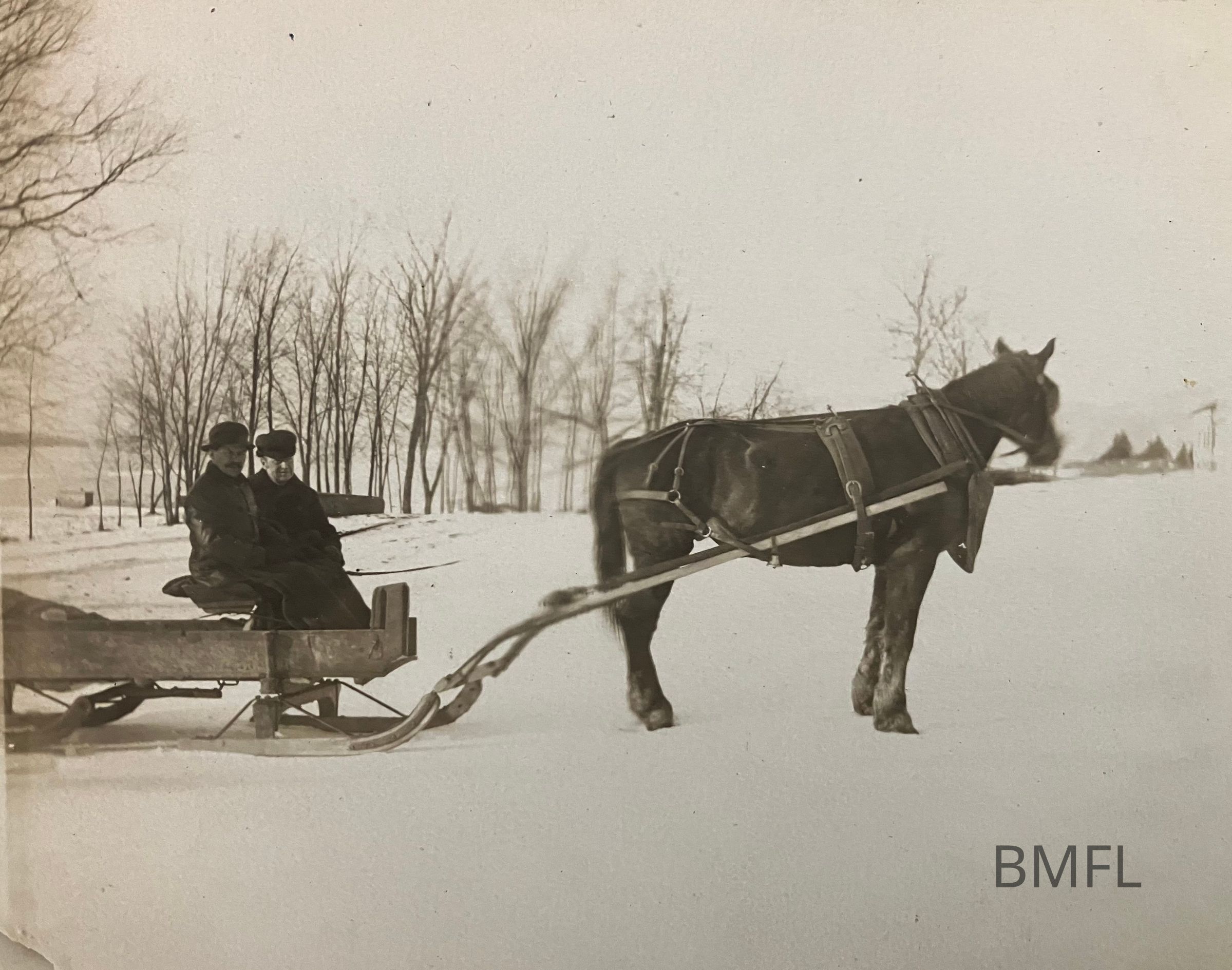 A horse pulling two people in a sled.Photograph Details