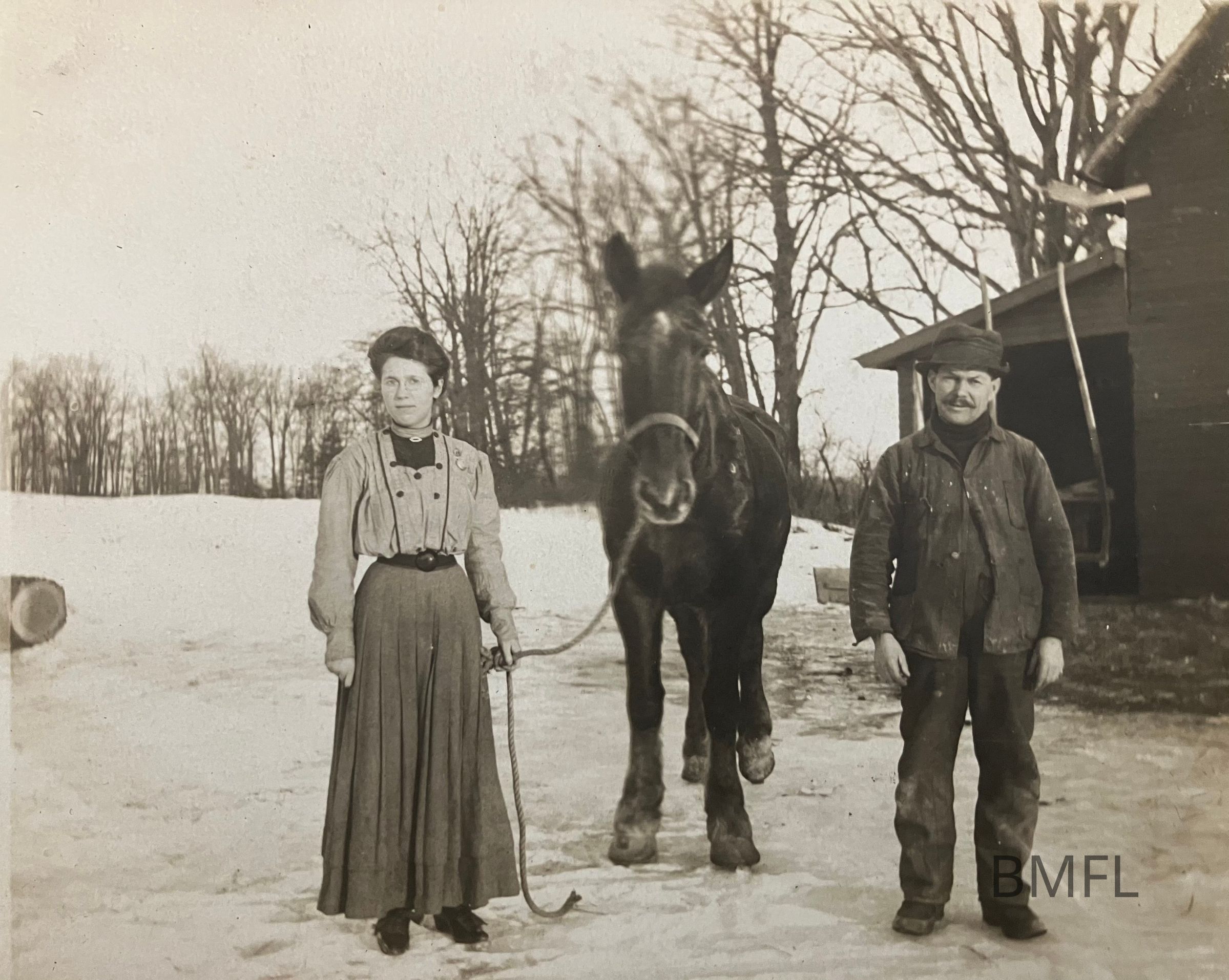 A woman in a long skirt stands on a snowy yard holding a rope attached to the bridle of a horse. A man stands next the horse and in front of a shedPhotograph Details