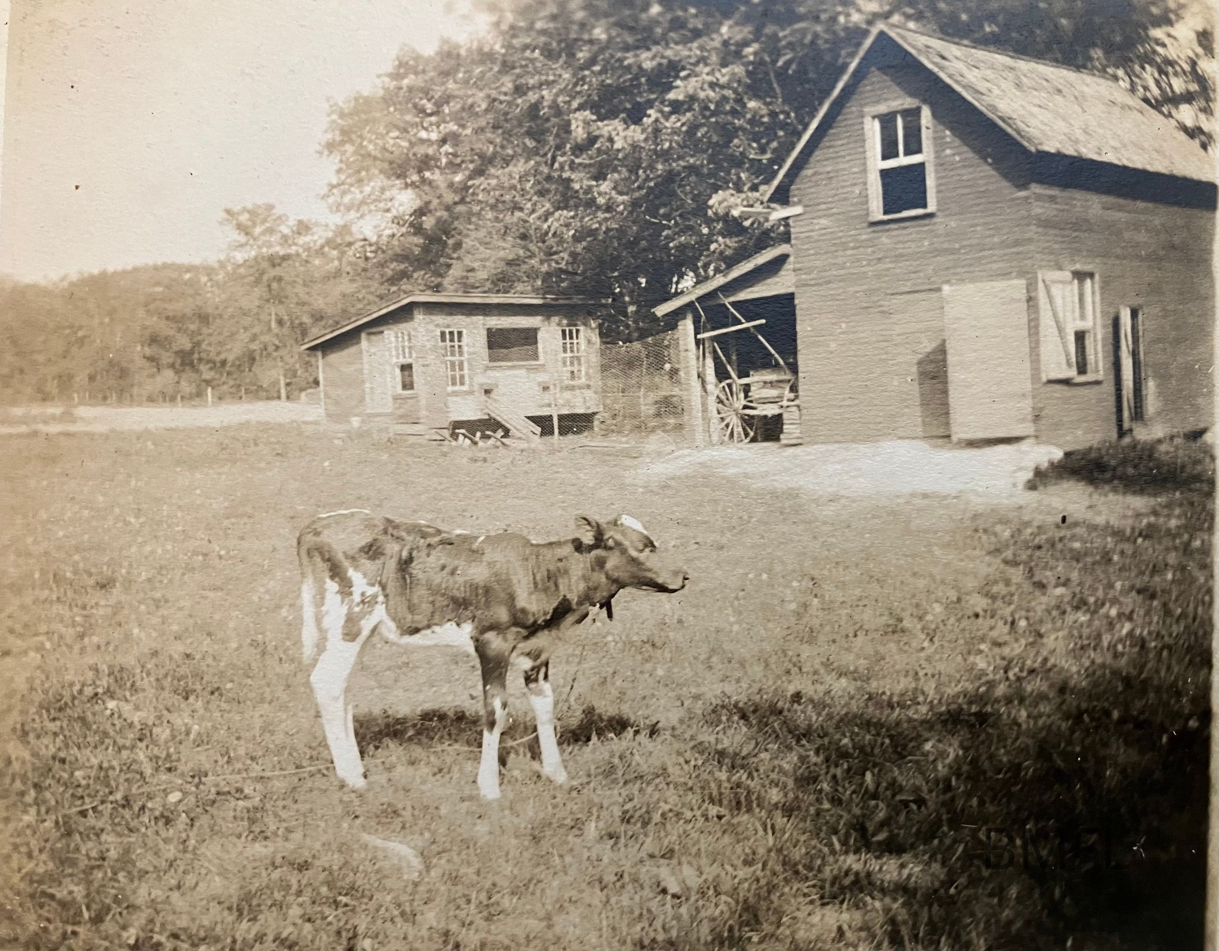 A calf standing in front of a shed and a chicken coopPhotograph Details