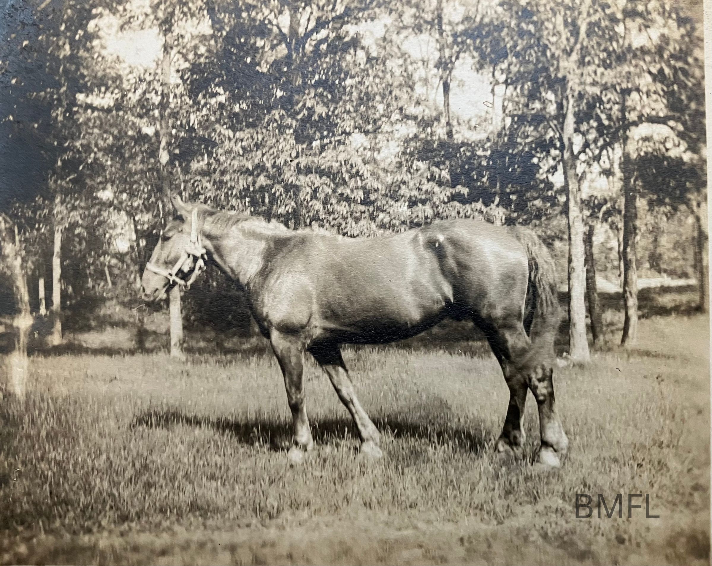 A side view of a horse (Dan Patch) in a field with woods behindPhotograph Details