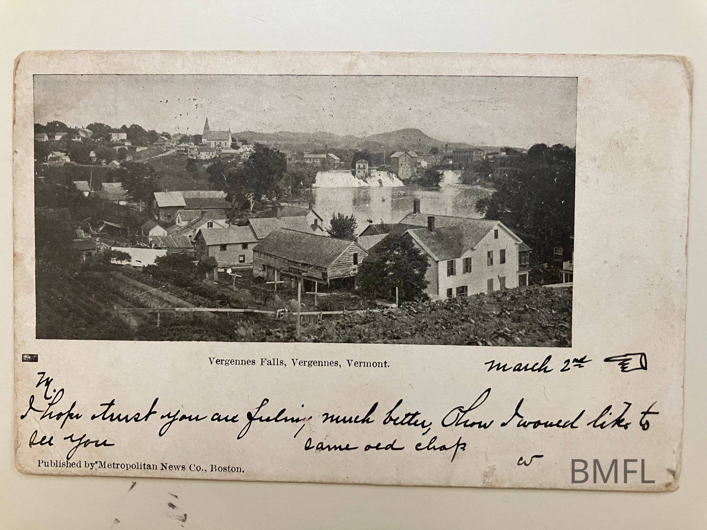 Underneath the photograph is a note to M. expressing hope that she is feeling better. The card was sent to a woman in Fort Washington, Pa. from Boston in 1908.Collection