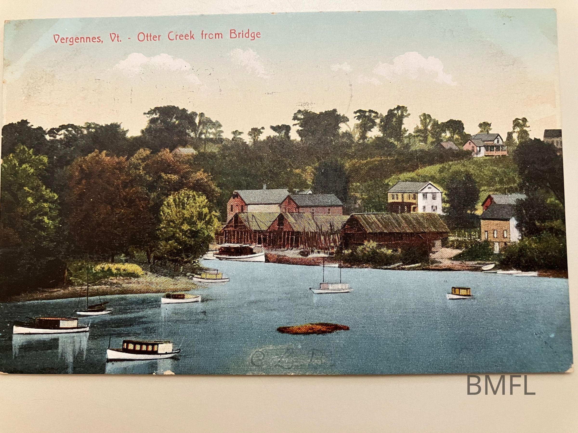 A colorized image looking down Otter Creek from the bridge. Several boats are moored and commercial sheds and warehouses are visible on the far shore which is along McDonough Drive.