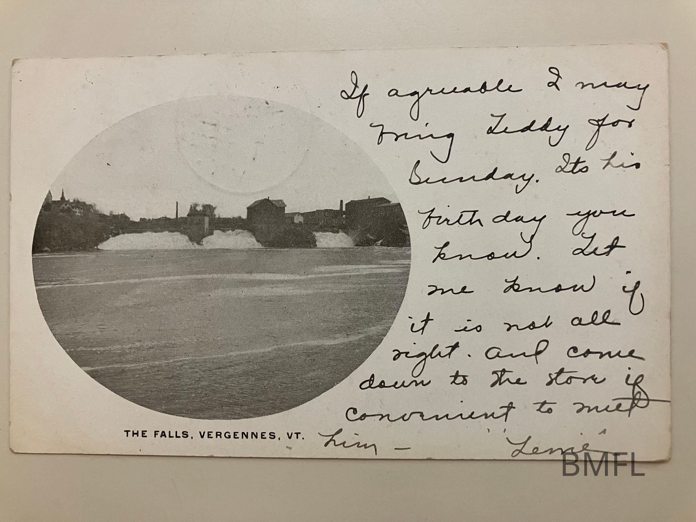 A view of the falls from downstream -- perhaps taken from a boat in the Otter Creek. Sender wrote a note next to the round photo asking if it was ok to bring "Teddy" on Sunday. The card was sent to Esther Lyon in Burlington.Collection
