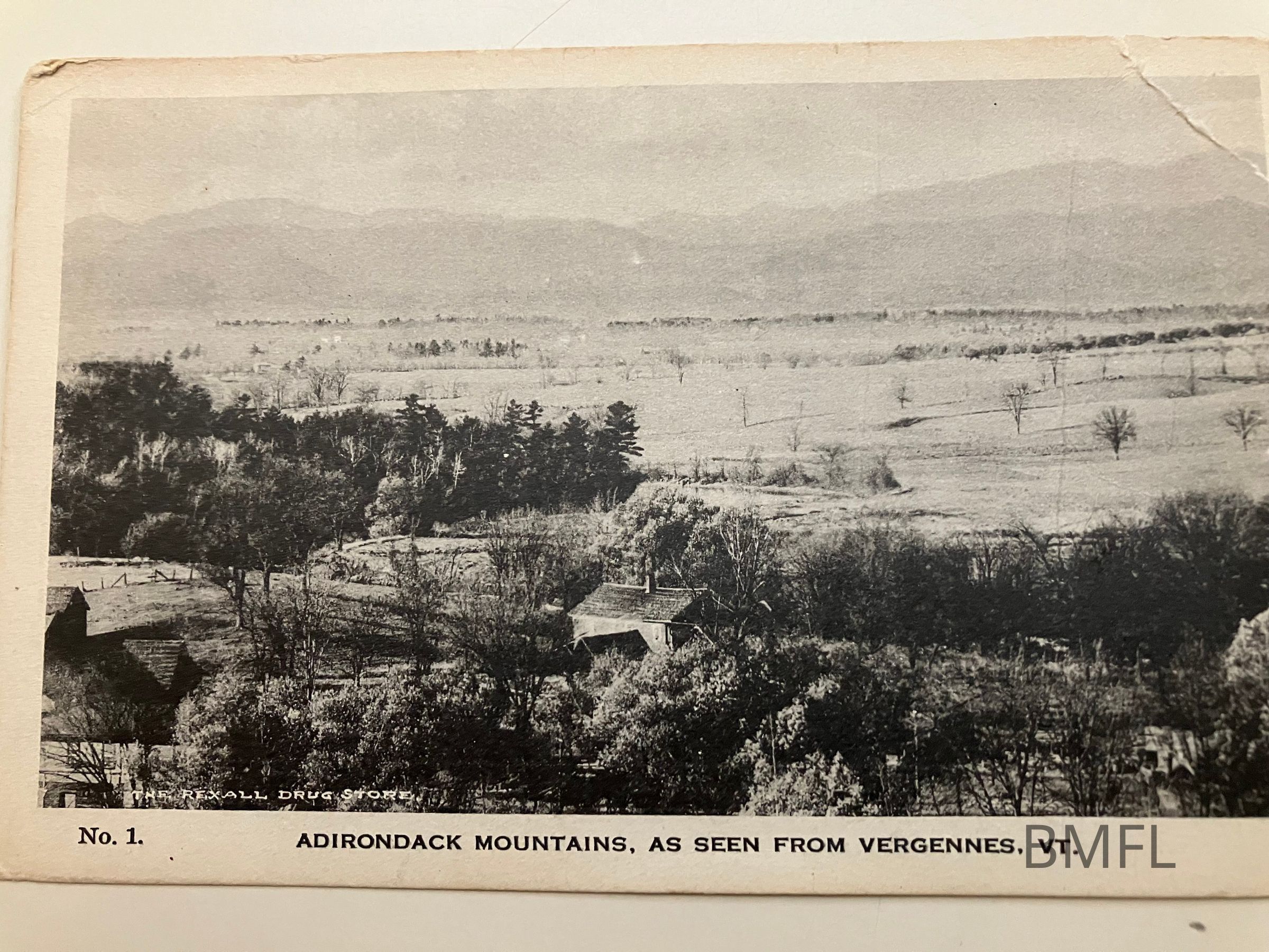 Image shows a couple of roofs of buildings in the near third of the card, then open fields with a scattering of trees and in the background the Adirondack Mountains in New York.